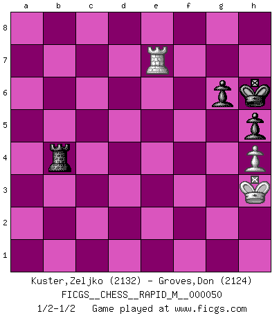 Last move : 1/2-1/2 2012 January 15 10:4:40 [Event "FICGS__CHESS__RAPID_M__000050"] [Site "FICGS"] [Date "2011.12.13"] [Round "1"] [White "Kuster,Zeljko"] [Black "Groves,Don"] [Result "1/2-1/2"] [WhiteElo "2132"] [BlackElo "2124"] 1.Nf3 d5 2.e3 c5 3.c4 d4 4.exd4 cxd4 5.g3 Nf6 6.Bg2 Nc6 7.d3 e5 8.O-O Bd6 9.Bg5 h6 10.Bxf6 Qxf6 11.Nbd2 Bc7 12.Qa4 O-O 13.b4 Bf5 14.Qb3 Rab8 15.Rfe1 b6 16.Nh4 Bd7 17.Bd5 Qd8 18.Ng6 Re8 19.Ne4 Ne7 20.Nxe7+ Rxe7 21.b5 Kh7 22.Kg2 f5 23.Nd2 Bc8 24.a4 Bd6 25.Ra2 Bb7 26.Bxb7 R8xb7 27.Rea1 Qe8 28.Re1 Rbd7 29.a5 Bc5 30.axb6 axb6 31.f3 Qg6 32.Qb1 h5 33.Kh1 Re6 34.Re2 Rde7 35.Rg2 Rf7 36.Ra8 Qh6 37.Nb3 e4 38.dxe4 fxe4 39.fxe4 Qg6 40.Nxc5 bxc5 41.R8a2 Rf3 42.Rgf2 Re3 43.Rae2 R6xe4 44.Rxe3 dxe3 45.Re2 Rxc4 46.Qxg6+ Kxg6 47.Rxe3 Rb4 48.Re5 Rxb5 49.h4 Rb3 50.Rxc5 Rxg3 51.Kh2 Ra3 52.Kg2 Ra2+ 53.Kg3 Ra4 54.Rc6+ Kh7 55.Rc5 g6 56.Rc7+ Kh6 57.Kh3 Rd4 58.Re7 Rb4 1/2-1/2 Reti Opening Kingside Castling by player White (move 8) Kingside Castling by player Black (move 12) 10 pieces endgame at move 47 : White KRPPP , Black KRPPP WHITE : King + 1 Rook 3 Pawns BLACK : King + 1 Rook 3 Pawns 9 pieces endgame at move 48 : White KRPP , Black KRPPP WHITE : King + 1 Rook 2 Pawns BLACK : King + 1 Rook 3 Pawns 8 pieces endgame at move 50 : White KRPP , Black KRPP WHITE : King + 1 Rook 2 Pawns BLACK : King + 1 Rook 2 Pawns 7 pieces endgame at move 50 : White KRP , Black KRPP WHITE : King + 1 Rook 1 Pawn BLACK : King + 1 Rook 2 Pawns This chess game ended in a draw. Follow this game move after move (download)The chessboard is the world, the pieces are the phenomena of the Universe, the rules of the game are what we call the laws of Nature and the player on the other side is hidden from us. (Thomas Huxley) Wenn Dein Gegner dir ein Remis anbietet, versuch herauszufinden, weshalb er glaubt schlechter zu stehen. (Nigel Short) El Ajedrez es tan inspirador que yo no creo que un buen jugador sea capaz de tener un pensamiento malo durante una partida. (Wilhelm Steinitz) Le joueur d'Echecs qui veut atteindre le top est obligé de développer son propre credo créatif. Alexeï Stepanovicth Souétine. Il est facile d'écrire des livres ! Ce qui est difficile, c'est de jouer ! (Alexeï Stepanovicth Souétine) Who needs drugs and alcohol if he can play Big Chess at FICGS ? (Heinz-Georg Lehnhoff)