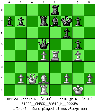 Last move : 1/2-1/2 2012 March 2 4:33:39 [Event "FICGS__CHESS__RAPID_M__000050"] [Site "FICGS"] [Date "2011.12.13"] [Round "1"] [White "Bernal Varela,Nelson"] [Black "Oortwijn,Ron"] [Result "1/2-1/2"] [WhiteElo "2130"] [BlackElo "2107"] 1.e4 e5 2.Nf3 Nf6 3.Nxe5 d6 4.Nf3 Nxe4 5.d4 d5 6.Bd3 Nc6 7.O-O Be7 8.c4 Nb4 9.cxd5 Nxd3 10.Qxd3 Qxd5 11.Re1 Bf5 12.g4 Bg6 13.Nc3 Nxc3 14.Qxc3 f6 15.Nh4 Kf7 16.Qxc7 Rhe8 17.Nxg6 hxg6 18.Bf4 Rad8 19.Rad1 Rd7 20.Qc2 Qxa2 21.Re4 g5 22.Bd2 Qd5 1/2-1/2 Petrov : Classical attack Kingside Castling by player White (move 7) This chess game ended in a draw. Follow this game move after move (download)Chess is a terrific way for kids to build self image and self esteem. (Saudin Robovic) Spielt Blackmar-Diemer-Gambit, und das Matt kommt von selbst! (Emil Joseph Diemer) Observen a Garry Kasparov. Después de una derrota, invariablemente el gana la próxima partida. Prácticamente hace pedazos a su siguiente oponente. Eso es algo que tenemos que aprender a lograr. (Maurice Ashley) Il n'y a pas eu de défaite parce que je ne crois pas que cet ordinateur ait jamais existé. IBM a triché en refusant d'imprimer les modes de recherche de la machine. C'est évident, pendant le match, des coups décisifs ont été joués par des êtres humains. Aujourd'hui, les meilleurs spécialistes en informatique ne peuvent toujours pas expliquer comment Deep-Blue a pu jouer contre la logique des ordinateurs. IBM a gagné une guerre de communication, mais ils sont incapables de prouver que l'ordinateur a gagné tout seul. (Garry Kasparov) I couldn't make any sense out of what this particular thread is about. It sounds like R2 D2 computer speaking. A space fight ?!? Some 'command' problems in Moscow ? Some killers & narcotic addicts attacking some game & a god wannabe ?? (Dinesh De Silva, lost in a russian conflict in FICGS forum)