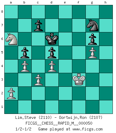 Last move : 1/2-1/2 2012 March 26 12:16:12 [Event "FICGS__CHESS__RAPID_M__000050"] [Site "FICGS"] [Date "2011.12.13"] [Round "1"] [White "Lim,Steve"] [Black "Oortwijn,Ron"] [Result "1/2-1/2"] [WhiteElo "2110"] [BlackElo "2107"] 1.e4 e5 2.Nf3 Nf6 3.Nxe5 d6 4.Nf3 Nxe4 5.d4 d5 6.Bd3 Nc6 7.O-O Be7 8.Nbd2 Nxd2 9.Bxd2 Bg4 10.c3 Qd7 11.Re1 O-O 12.h3 Bf5 13.Bf4 Bxd3 14.Qxd3 Bd6 15.Bxd6 Qxd6 16.Re2 Rfe8 17.Rae1 Rxe2 18.Qxe2 h6 19.g3 a6 20.Nh4 Rd8 21.Qe3 Kf8 22.Nf5 Qf6 23.g4 Qg5 24.f4 Qf6 25.Kg2 b5 26.Re2 h5 27.Ng3 hxg4 28.hxg4 Qh4 29.g5 g6 30.Kf3 Qh3 31.Qg1 Kg7 32.Rh2 Qc8 33.f5 Rh8 34.Rxh8 Kxh8 35.Qe3 Kg8 36.fxg6 fxg6 37.Ne2 Qh3+ 38.Kf2 Qf5+ 39.Qf4 Qf7 40.Qxf7+ Kxf7 41.Nf4 Ne7 42.b4 Ke8 43.Ne6 Kd7 44.Nc5+ Kd6 45.Nxa6 Nf5 46.Kf3 Ng7 1/2-1/2 Comment by player 1 : Steve Lim : 34.Rxh8?? (f6+!) +- misplayed... Petrov : Classical attack Kingside Castling by player White (move 7) Kingside Castling by player Black (move 11) This chess game ended in a draw. Follow this game move after move (download)The combination player thinks forward; he starts from the given position, and tries the forceful moves in his mind. (Emanuel Lasker) In der Schule lernt man nichts. Es ist nur Zeitverschwendung. (Robert James Fischer) En posiciones complicadas, Bobby Fischer pocas veces tuvo que temer de cualquiera. (Paul Keres) Pour se monter efficace, un Cavalier a besoin d'avant-postes ! Les Cavaliers font les meilleurs bloqueurs de pions passés. The arrogant army will lose certainly the battle. (Chinese proverb)