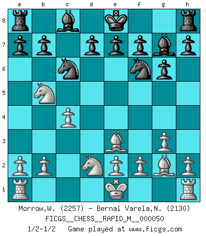 Last move : 1/2-1/2 2011 December 26 4:50:42 [Event "FICGS__CHESS__RAPID_M__000050"] [Site "FICGS"] [Date "2011.12.13"] [Round "1"] [White "Morrow,Wolff"] [Black "Bernal Varela,Nelson"] [Result "1/2-1/2"] [WhiteElo "2257"] [BlackElo "2130"] 1.d4 Nf6 2.c4 g6 3.g3 c5 4.Nf3 cxd4 5.Nxd4 Nc6 6.Bg2 Qb6 7.Nb5 Bg7 8.Be3 Qa5+ 9.Qd2 Qxd2+ 10.Nxd2 1/2-1/2 King's Indian : 3.g3 This chess game ended in a draw. Follow this game move after move (download)Botvinnik tried to take the mystery out of Chess, always relating it to situations in ordinary life. He used to call Chess a typical inexact problem similar to those which people are always having to solve in everyday life. (Garry Kasparov) Im Fernschach kannst du während dem Spiel rauchen. (John Christen Knudsen) El arma más poderosa en el Ajedrez, es tener la próxima movida. (David Bronstein) Avant la finale, les dieux ont créé le milieu de partie. (Tarrasch) There is a great deal of difference between an eager man who wants to read a book and a tired man who wants a book to read. (G.K. Chesterton)