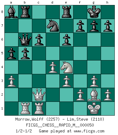 Last move : 1/2-1/2 2012 February 2 10:29:58 [Event "FICGS__CHESS__RAPID_M__000050"] [Site "FICGS"] [Date "2011.12.13"] [Round "1"] [White "Morrow,Wolff"] [Black "Lim,Steve"] [Result "1/2-1/2"] [WhiteElo "2257"] [BlackElo "2110"] 1.d4 d5 2.c4 e6 3.Nf3 Nf6 4.g3 dxc4 5.Bg2 Bb4+ 6.Bd2 a5 7.a3 Bxd2+ 8.Nbxd2 b5 9.b3 cxb3 10.Qxb3 c6 11.O-O O-O 12.Qb2 Nbd7 13.Rfc1 Qb6 14.Ng5 Bb7 15.Nge4 Nxe4 16.Nxe4 Rab8 17.Rab1 Ba8 18.e3 Rfe8 19.Qc2 1/2-1/2 Queen's gambit declined Kingside Castling by player White (move 11) Kingside Castling by player Black (move 11) This chess game ended in a draw. Follow this game move after move (download)Personally, I rather look forward to a computer program winning the world Chess Championship. Humanity needs a lesson in humility. (Richard Dawkings) Fallen sollten polizeilich verboten werden. (Savielly Grigorievitsch Tartakower) Juega la Apertura como un libro, el Juego Medio como un mago y los Finales como una máquina. (Spielmann) Les Echecs ont trois composantes : le temps, l'espace et le matériel en dernier. (Mikhail Tal) It's not a bug - it's an undocumented feature. (Anonymous)