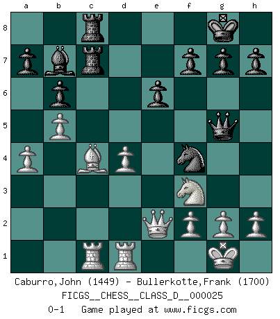 Last move : 0-1 2007 January 23 0:56:39 [Event "FICGS__CHESS__CLASS_D__000025"] [Site "FICGS"] [Date "2007.01.09"] [Round "1"] [White "Caburro,John"] [Black "Bullerkotte,Frank"] [Result "0-1"] [WhiteElo "1449"] [BlackElo "1700"] 1.d4 Nf6 2.c4 e6 3.Nf3 b6 4.e3 Bb7 5.Bd3 Bb4+ 6.Bd2 Bxd2+ 7.Nbxd2 c5 8.O-O cxd4 9.exd4 O-O 10.Qe2 d6 11.Rfe1 Nbd7 12.Rac1 Rc8 13.b4 Re8 14.Ne4 Nxe4 15.Bxe4 d5 16.Bd3 dxc4 17.Bxc4 Nf6 18.Red1 Re7 19.a4 Rec7 20.Ne5 Nd5 21.b5 Qg5 22.Nf3 Nf4 0-1 Queen's Indian : 4.e3 Kingside Castling by player White (move 8) Kingside Castling by player Black (move 9) Player Black won this chess game. Follow this game move after move (download)When the Chess game is over, the Pawn and the King go back to the same box. (Irish saying) Ich bewundere Kasparows phantasievolle Angriffssiege aus den Achtzigern und Neunzigern, aber wenn man sie mit dem Computer überprüft, nimmt der Computer in jeder zweiten Partie die Opfer an, verteidigt sich und gewinnt. (Vladimir Kramnik) Un entendimiento minucioso de las típicas continuaciones de mate hacen de las mas complicadas combinaciones de sacrificio que conducen hacia ellas no solo no dificiles, sino casi un asunto de rutina. (Siegbert Tarrasch) Soyez une menace à chaque fois que vous vous asseyez pour jouer. (Ken Smith) Winning isn't everything... but losing is nothing. (Mednis)