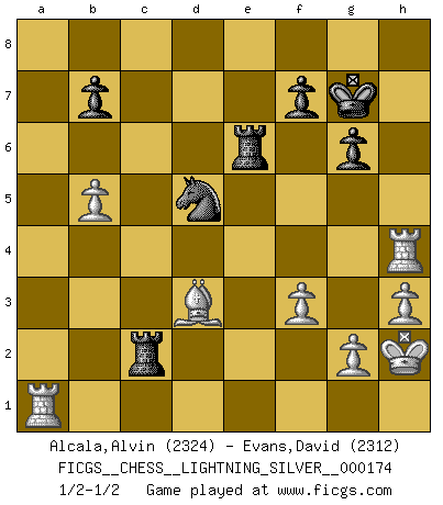 Last move : 1/2-1/2 2011 December 13 17:33:6 [Event "FICGS__CHESS__LIGHTNING_SILVER__000174"] [Site "FICGS"] [Date "2011.12.13"] [Round "1"] [White "Alcala,Alvin"] [Black "Evans,David"] [Result "1/2-1/2"] [WhiteElo "2324"] [BlackElo "2312"] 1.e4 c5 2.Nf3 d6 3.d4 cxd4 4.Nxd4 Nf6 5.Nc3 a6 6.f3 e5 7.Nb3 Be6 8.Be3 h5 9.Qd2 Nbd7 10.a4 Qc7 11.Be2 Be7 12.a5 h4 13.O-O O-O 14.Rfd1 Rac8 15.Bf1 Rfd8 16.Qe1 Nh7 17.h3 Re8 18.Nc1 Nhf8 19.Nd3 Ng6 20.Nb4 Nf4 21.Bxf4 exf4 22.Ncd5 Qc5+ 23.Kh1 Bd8 24.Nxf4 Bxa5 25.Nxa6 Bxe1 26.Nxc5 Rxc5 27.Nxe6 Rxe6 28.Rxe1 Rxc2 29.b4 Nf6 30.Kh2 g6 31.Red1 Kg7 32.b5 Rc5 33.Rd4 d5 34.exd5 Nxd5 35.Rxh4 Rc2 36.Bd3 1/2-1/2 Sicilian : Najdorf Kingside Castling by player White (move 13) Kingside Castling by player Black (move 13) This chess game ended in a draw. Follow this game move after move (download)All my games are real. (Bobby Fischer) Computer sind die einzigen Gegner, die nicht immer eine Ausrede auf Lager haben, wenn sie gegen mich verlieren. (Robert James Fischer) Yo no le temo a Spassky. Todos saben que yo soy el mejor. Uno no necesita un torneo para probarlo. (Bobby Fischer) J'ai toujours senti une vague pitié pour l'homme qui ne connaît rien aux échecs, tout comme j'en aurais pour un homme ignorant de l'amour. Les Echecs, comme la musique ou comme l'amour, ont le pouvoir de rendre heureux. (Siegbert Tarrasch) Memory is a crazy woman that hoards colored rags and throws away food. (Austin O'Malley)