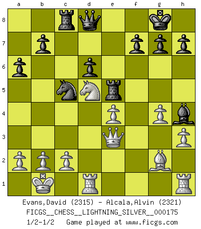 Last move : 1/2-1/2 2011 December 13 17:56:32 [Event "FICGS__CHESS__LIGHTNING_SILVER__000175"] [Site "FICGS"] [Date "2011.12.13"] [Round "1"] [White "Evans,David"] [Black "Alcala,Alvin"] [Result "1/2-1/2"] [WhiteElo "2315"] [BlackElo "2321"] 1.e4 c5 2.Nf3 d6 3.d4 cxd4 4.Nxd4 Nf6 5.Nc3 a6 6.Be3 e5 7.Nb3 Be6 8.h3 Be7 9.f4 exf4 10.Bxf4 O-O 11.Qe2 Nbd7 12.g4 Ne5 13.O-O-O Nfd7 14.Kb1 Rc8 15.Qe1 Re8 16.Nd4 Bf6 17.Nxe6 Rxe6 18.Nd5 Bh4 19.Qe3 Nc5 20.Bxe5 Rxe5 21.Bg2 1/2-1/2 Sicilian : Najdorf, Byrne (English) attack Kingside Castling by player Black (move 10) Queenside Castling by player White (move 13) This chess game ended in a draw. Follow this game move after move (download)Chess is a forcing house where the fruits of character can ripen more fully than in life. (Edward Morgan Foster) Ein Schachgenie ist jemand der verdammt gut Schach spielt. (Jonathan Levitt) Tu sabes que vas a perder. Aún cuando tenía la ventaja, yo sabía que iba a perder. - al estar jugando con Fischer (Andrew Soltis) Toute estimation doit être constamment réévaluée. (Jacob Estrin) In theory there is no difference between theory and practice. In practice there is. (Yogi Berra)