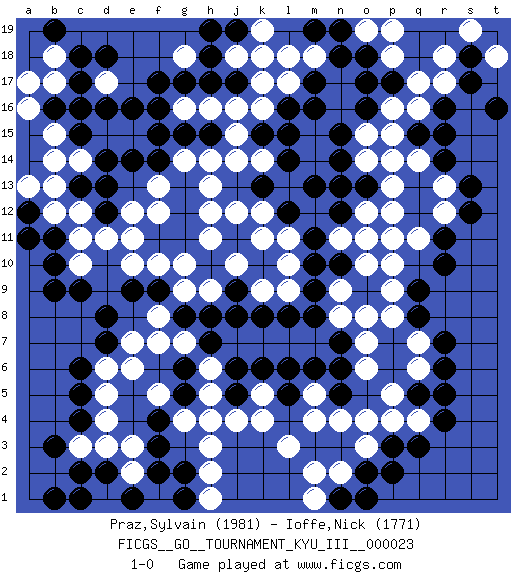 Last move : 1-0 2012 April 23 15:25:4 [Event "FICGS__GO__TOURNAMENT_KYU_III__000023"] [Site "FICGS"] [Date "2011.12.14"] [Round "1"] [Black "Praz,Sylvain"] [White "Ioffe,Nick"] [Result "1-0"] [Rating 1 "1981"] [Rating 2 "1771"] 1.r16 d4 2.q3 c16 3.e16 h16 4.e14 c14 5.c17 d17 6.d16 b17 7.c18 b18 8.d18 p16 9.c15 b15 10.b16 a16 11.c16 b13 12.m16 p14 13.r14 r17 14.s17 r18 15.s18 p18 16.f3 h3 17.c6 d6 18.d7 e6 19.c4 c3 20.c5 e3 21.f4 h5 22.c9 e7 23.d8 e12 24.d13 c12 25.d12 c10 26.b10 d11 27.b11 c11 28.f9 h13 29.f11 e11 30.g13 f12 31.g12 f10 32.g11 g10 33.h10 g9 34.e9 e10 35.m13 l17 36.m17 m18 37.n18 l18 38.o17 q16 39.r15 p12 40.p17 q17 41.k15 k16 42.l16 j16 43.h18 g18 44.g17 j18 45.h17 j14 46.j17 k17 47.k13 g14 48.f14 g16 49.f17 j12 50.k10 h11 51.j11 f13 52.r11 p10 53.q9 k12 54.l12 k14 55.l14 l11 56.m11 p9 57.q8 l10 58.m10 l9 59.m9 o8 60.l8 o6 61.k8 k9 62.q5 o4 63.o2 m4 64.n7 o7 65.l6 l3 66.n6 q11 67.r10 r12 68.s12 r13 69.s13 q14 70.j9 k11 71.j6 h6 72.h7 g7 73.b3 d5 74.c2 d3 75.h8 h9 76.j5 j4 77.n5 n4 78.d2 e2 79.o13 p13 80.o11 p11 81.o16 o12 82.n12 o14 83.n14 q6 84.r6 q7 85.r7 p4 86.p3 q4 87.r4 n2 88.n1 m2 89.j8 j10 90.j19 k18 91.b19 a17 92.d14 b12 93.g15 h12 94.f16 o3 95.p2 d1 96.b1 s19 97.b9 t18 98.t16 n8 99.m8 k5 100.k6 o10 101.c13 b14 102.l5 k4 103.o18 o19 104.n19 p19 105.n13 p5 106.r5 o15 107.q15 p15 108.n15 m1 109.o1 p8 110.h15 j15 111.l15 m5 112.m6 h14 113.f15 k19 114.h19 n11 115.n10 o11 116.a12 a13 117.a11 n9 118.g8 f8 119.g6 f7 120.g5 h4 121.f2 f1 122.g2 h2 123.g1 h1 124.e1 f5 125.c1 g4 126.m19 1-0 Here are the names of the openings (joseki) played in the four corners : Corner d16 : c16 e16 Komoku (Somok, Xiao~mu`) 3-4 Point. The komoku (3-4) point is the traditional corner enclosure move.. Ikken Takagakari (Hankan Nop'dakeolch'im, Yi Gaogua`jiao~, 1-Space High Approach). The 5-4 approach move has become more popular in modern times, as modern Go emphasizes speed and influence. Corner q16 : r16 p16 Komoku (Somok, Xiao~mu`) 3-4 Point. The komoku (3-4) point is the traditional corner enclosure move.. Ikken Takagakari (Hankan Nop'dakeolch'im, Yi Gaogua`jiao~, 1-Space High Approach). The 5-4 approach move has become more popular in modern times, as modern Go emphasizes speed and influence. Corner d4 : d4 f3 Hoshi (Hwajeom, Seongjeom, Xingwei`) 4-4 Point. The star or hoshi (4-4) point, emphasizing influence at the potential expense of territory. Ikken Kakari (Hankan Keolch'im, Yi Gua`jiao~, 1-Space Low Approach). Black 2 is the standard approach move to the 4-4. Player Black won this Go (weiqi, baduk) game. Follow this game move after move (download)If your stone is capped, play the knight's move. (Anonymous) Bobby never cared about money, though. His only desire was to prove that his choices were correct: He wanted chess to be important because he was a chess player, and he wanted to be important. Bobby knew money was important, but he didn't have a clue why, outside of clothes and status. The only way he could accomplish what he wanted was to fight for a lot of money. Once he got it, he gave it away. He did not know how to spend it. And once he'd become champion, after, essentially, sacrificing his life for it, he didn't know how to spend his time. (Bob Wade)