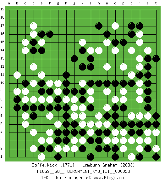 Last move : 1-0 2011 December 30 1:29:22 [Event "FICGS__GO__TOURNAMENT_KYU_III__000023"] [Site "FICGS"] [Date "2011.12.14"] [Round "1"] [Black "Ioffe,Nick"] [White "Lamburn,Graham"] [Result "1-0"] [Rating 1 "1771"] [Rating 2 "2083"] 1.q16 d4 2.q4 d17 3.q10 o3 4.m3 q6 5.p5 r3 6.r4 q3 7.n4 o17 8.m17 q14 9.p15 r16 10.r17 r15 11.q17 r12 12.s11 p12 13.o10 n12 14.m10 n9 15.n10 p9 16.p10 n7 17.s7 r8 18.s8 r9 19.s9 r10 20.r11 q11 21.s10 r6 22.s5 k10 23.k9 l9 24.l10 l8 25.l12 o14 26.o15 m14 27.k14 k13 28.l13 l14 29.j13 n15 30.n16 k15 31.k12 k3 32.d15 d12 33.f16 e15 34.e16 d16 35.e14 c15 36.d14 c14 37.j9 l5 38.d6 f4 39.c10 c6 40.c7 c5 41.k4 l4 42.l3 j3 43.j5 j6 44.h5 f6 45.h6 j7 46.h7 o4 47.o5 k5 48.j4 n5 49.h3 h2 50.g3 g2 51.f2 f3 52.e2 h4 53.g4 g5 54.h4 h8 55.g7 l2 56.m2 j2 57.l1 d2 58.k2 e3 59.o2 p2 60.o1 n3 61.m4 m5 62.p3 p4 63.n2 p3 64.q5 s3 65.r1 s4 66.r5 s6 67.t6 t4 68.t5 q1 69.s2 r2 70.t1 t2 71.t3 s1 72.g1 e1 73.r1 t2 74.p7 p8 75.o7 o8 76.s12 r13 77.s13 s14 78.t13 f8 79.g8 g9 80.h9 j8 81.f9 g10 82.f7 e8 83.e7 d8 84.d7 c8 85.b8 b9 86.b7 c9 87.e10 b11 88.h11 f10 89.e9 e11 90.h10 d10 91.k8 k7 92.l7 k6 93.n6 m6 94.o6 1-0 Here are the names of the openings (joseki) played in the four corners : Corner q4 : q4 o3 Hoshi (Hwajeom, Seongjeom, Xingwei`) 4-4 Point. The star or hoshi (4-4) point, emphasizing influence at the potential expense of territory. Ikken Kakari (Hankan Keolch'im, Yi Gua`jiao~, 1-Space Low Approach). White 2 is the standard approach move to the 4-4. Corner q16 : q16 o17 Hoshi (Hwajeom, Seongjeom, Xingwei`) 4-4 Point. The star or hoshi (4-4) point, emphasizing influence at the potential expense of territory. Ikken Kakari (Hankan Keolch'im, Yi Gua`jiao~, 1-Space Low Approach). White 2 is the standard approach move to the 4-4. Corner d16 : d17 j13 Komoku (Somok, Xiao~mu`) 3-4 Point. The komoku (3-4) point is the traditional corner enclosure move.. Corner d4 : d4 j9 Hoshi (Hwajeom, Seongjeom, Xingwei`) 4-4 Point. The star or hoshi (4-4) point, emphasizing influence at the potential expense of territory. Player Black won this Go (weiqi, baduk) game. Follow this game move after move (download)Win the early ko to win the game. (Anonymous) Happy endings are just stories that haven't finished yet. (Jane Smith in Mr & Mrs Smith)