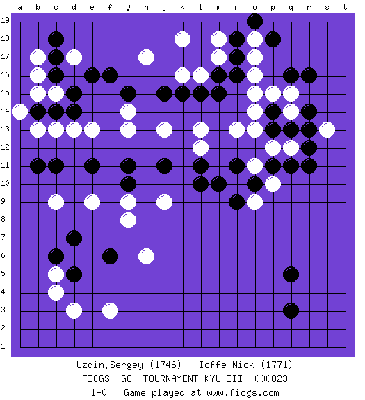 Last move : 1-0 2012 February 6 21:1:2 [Event "FICGS__GO__TOURNAMENT_KYU_III__000023"] [Site "FICGS"] [Date "2011.12.14"] [Round "1"] [Black "Uzdin,Sergey"] [White "Ioffe,Nick"] [Result "1-0"] [Rating 1 "1746"] [Rating 2 "1771"] 1.q16 d17 2.q3 d3 3.d5 c5 4.c6 c4 5.d7 f3 6.c11 c13 7.q5 o17 8.r14 k16 9.d15 e13 10.f16 c15 11.d14 d13 12.c14 b15 13.b14 b13 14.c16 b16 15.c17 b17 16.c18 a14 17.e16 h17 18.g15 g13 19.j15 c9 20.e11 e9 21.g11 j13 22.j11 g9 23.f6 j9 24.l11 l13 25.n11 h6 26.g10 g8 27.k15 l16 28.b11 g14 29.l15 n13 30.m15 l12 31.l10 o15 32.m16 m17 33.n16 o16 34.n17 m18 35.n18 k18 36.p13 o13 37.p18 o11 38.o10 p12 39.q11 q12 40.r11 s13 41.r12 q14 42.p14 p15 43.q13 q15 44.r13 o14 45.r16 o18 46.o19 n10 47.n9 p10 48.m10 o9 49.p11 1-0 Here are the names of the openings (joseki) played in the four corners : Corner d4 : d3 d5 Komoku (Somok, Xiao~mu`) 3-4 Point. The komoku (3-4) point is the traditional corner enclosure move.. Ikken Takagakari (Hankan Nop'dakeolch'im, Yi Gaogua`jiao~, 1-Space High Approach). The 5-4 approach move has become more popular in modern times, as modern Go emphasizes speed and influence. Corner d16 : d17 c11 Komoku (Somok, Xiao~mu`) 3-4 Point. The komoku (3-4) point is the traditional corner enclosure move.. Corner q16 : q16 o17 Hoshi (Hwajeom, Seongjeom, Xingwei`) 4-4 Point. The star or hoshi (4-4) point, emphasizing influence at the potential expense of territory. Ikken Kakari (Hankan Keolch'im, Yi Gua`jiao~, 1-Space Low Approach). White 2 is the standard approach move to the 4-4. Player Black won this Go (weiqi, baduk) game. Follow this game move after move (download)Don't reduce your own liberties. (Bill Taylor) It is not enough to be a good player... you must also play well. (Siegbert Tarrasch)