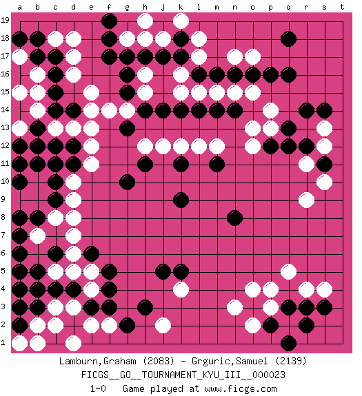 Last move : 1-0 2011 December 22 22:39:13 [Event "FICGS__GO__TOURNAMENT_KYU_III__000023"] [Site "FICGS"] [Date "2011.12.14"] [Round "1"] [Black "Lamburn,Graham"] [White "Grguric,Samuel"] [Result "1-0"] [Rating 1 "2083"] [Rating 2 "2139"] 1.q16 q5 2.e3 d16 3.c4 d10 4.f17 k16 5.d14 e15 6.g15 e14 7.d12 e13 8.b12 d18 9.h17 e12 10.d11 e11 11.c10 d9 12.c9 d8 13.j14 o17 14.r14 c8 15.c15 j12 16.l14 m15 17.k18 l12 18.m14 o15 19.n14 p14 20.q18 e5 21.f5 e4 22.f4 k4 23.q3 p3 24.p2 p4 25.o3 q2 26.r2 o2 27.q1 n3 28.k11 k12 29.k9 o4 30.q13 k15 31.k14 l17 32.n16 n15 33.o16 n17 34.p16 l18 35.m16 l15 36.k17 p13 37.p12 o13 38.l16 o12 39.q12 h16 40.g16 h15 41.h14 g14 42.g13 f14 43.m11 m12 44.n8 g18 45.f18 r4 46.r3 r9 47.h11 h12 48.h3 h18 49.g17 j18 50.j17 s4 51.s3 k19 52.j19 h19 53.f19 s12 54.s11 r11 55.r12 s13 56.s14 s10 57.g10 d3 58.d4 e2 59.f3 c3 60.b3 b4 61.b5 a4 62.a5 c5 63.a3 b4 64.a4 d5 65.b4 b2 66.a2 c2 67.c6 d7 68.b8 b7 69.a7 b9 70.a8 f2 71.g2 d1 72.e6 d6 73.j5 d13 74.c12 b10 75.c11 a9 76.a6 b14 77.c14 c13 78.b13 b15 79.c16 b16 80.c17 c18 81.b17 a13 82.a11 a17 83.a18 a15 84.a16 b1 85.b11 a17 86.b18 d17 87.a16 a1 88.a10 a17 89.a12 j2 90.k5 1-0 Graham Lamburn Many thanks for the extremely fun game! Some fabulously complex stuff at the top and on the left :) Here are the names of the openings (joseki) played in the four corners : Corner d16 : d16 f17 Hoshi (Hwajeom, Seongjeom, Xingwei`) 4-4 Point. The star or hoshi (4-4) point, emphasizing influence at the potential expense of territory. Ikken Kakari (Hankan Keolch'im, Yi Gua`jiao~, 1-Space Low Approach). Black 2 is the standard approach move to the 4-4. Corner q16 : q16 o17 Hoshi (Hwajeom, Seongjeom, Xingwei`) 4-4 Point. The star or hoshi (4-4) point, emphasizing influence at the potential expense of territory. Ikken Kakari (Hankan Keolch'im, Yi Gua`jiao~, 1-Space Low Approach). White 2 is the standard approach move to the 4-4. Corner q4 : q5 q3 Takamoku (Gomok, Gaomu`) 5-4 Point. The takamoku (high) point (5-4). With its emphasis on influence, the 5-4 point complements the 4-4 (hoshi) point in creating an influence-oriented fuseki. Komoku. White responds with 3-3, 3-5, 4-6, 4-7, 3-6, 3-7. Player Black won this Go (weiqi, baduk) game. Follow this game move after move (download)There is death in the hane. (Anonymous) The next best thing to gambling and winning is gambling and loosing. (Nick Dandalos)