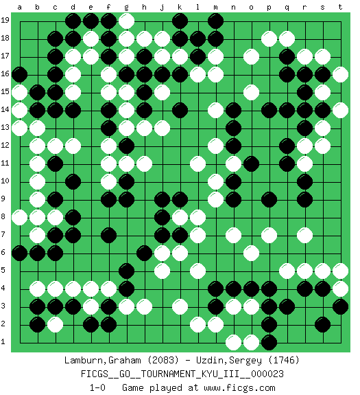 Last move : 1-0 2012 February 17 21:54:16 [Event "FICGS__GO__TOURNAMENT_KYU_III__000023"] [Site "FICGS"] [Date "2011.12.14"] [Round "1"] [Black "Lamburn,Graham"] [White "Uzdin,Sergey"] [Result "1-0"] [Rating 1 "2083"] [Rating 2 "1746"] 1.q16 d4 2.q3 d16 3.r9 o17 4.q14 m16 5.f17 j17 6.c17 d17 7.c16 d15 8.d18 e18 9.c18 e17 10.c14 q5 11.r4 r5 12.p4 r7 13.p9 p7 14.f3 h3 15.m3 f4 16.c3 c4 17.d3 e3 18.e2 e4 19.d10 d12 20.d7 r17 21.q17 q18 22.r16 p18 23.f18 f16 24.e19 g17 25.d14 s17 26.f14 f12 27.g16 g18 28.f19 g19 29.d19 g15 30.h16 f15 31.h15 g14 32.f13 g13 33.h17 j18 34.g12 h18 35.k16 f11 36.k14 j13 37.l17 l18 38.m18 l19 39.m19 m17 40.k18 j15 41.j16 k17 42.h14 h13 43.k19 l16 44.l18 h11 45.f2 r12 46.q12 s15 47.r13 r11 48.q11 s13 49.s14 t14 50.r14 s12 51.s16 t16 52.r10 b12 53.f7 k3 54.g4 g3 55.g5 c2 56.b3 b4 57.b2 b7 58.b8 c8 59.c7 b9 60.b6 a8 61.c6 j5 62.h6 l5 63.a6 n3 64.n4 o3 65.o4 m2 66.m4 l2 67.p2 l7 68.c11 c12 69.d8 b11 70.g10 g11 71.p3 f10 72.g9 o1 73.c9 b10 74.n9 n7 75.n14 m14 76.n13 n11 77.m11 m10 78.n10 m12 79.n12 l11 80.o11 s5 81.s4 o15 82.p14 b8 83.f9 o6 84.p1 n1 85.c15 m9 86.j9 j6 87.j7 a15 88.b15 a14 89.a16 b13 90.k7 k8 91.j8 k6 92.k9 t4 93.t3 t5 94.s2 l8 95.b14 a13 96.r15 1-0 Here are the names of the openings (joseki) played in the four corners : Corner q16 : q16 o17 Hoshi (Hwajeom, Seongjeom, Xingwei`) 4-4 Point. The star or hoshi (4-4) point, emphasizing influence at the potential expense of territory. Ikken Kakari (Hankan Keolch'im, Yi Gua`jiao~, 1-Space Low Approach). White 2 is the standard approach move to the 4-4. Corner d16 : d16 f17 Hoshi (Hwajeom, Seongjeom, Xingwei`) 4-4 Point. The star or hoshi (4-4) point, emphasizing influence at the potential expense of territory. Ikken Kakari (Hankan Keolch'im, Yi Gua`jiao~, 1-Space Low Approach). Black 2 is the standard approach move to the 4-4. Corner d4 : d4 f3 Hoshi (Hwajeom, Seongjeom, Xingwei`) 4-4 Point. The star or hoshi (4-4) point, emphasizing influence at the potential expense of territory. Ikken Kakari (Hankan Keolch'im, Yi Gua`jiao~, 1-Space Low Approach). Black 2 is the standard approach move to the 4-4. Player Black won this Go (weiqi, baduk) game. Follow this game move after move (download)Keep away from thickness. (Anonymous) Two beer, or not two beer. (Unknown)