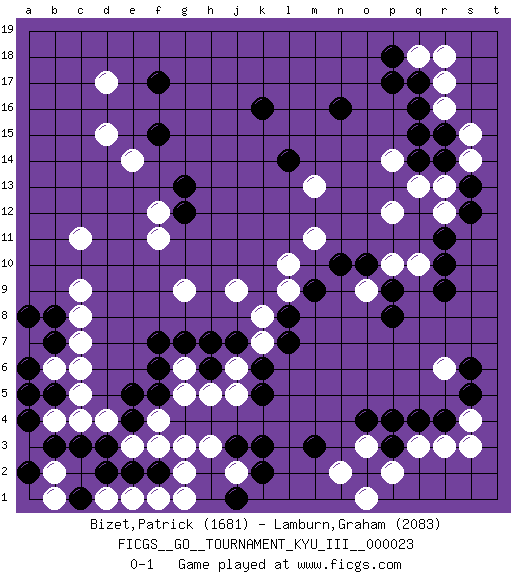 Last move : 0-1 2012 May 25 2:26:16 [Event "FICGS__GO__TOURNAMENT_KYU_III__000023"] [Site "FICGS"] [Date "2011.12.14"] [Round "1"] [Black "Bizet,Patrick"] [White "Lamburn,Graham"] [Result "0-1"] [Rating 1 "1681"] [Rating 2 "2083"] 1.q4 d4 2.q16 d17 3.k3 r6 4.r10 r3 5.r4 q3 6.p4 s4 7.s5 s3 8.s6 o3 9.p3 p2 10.o2 n2 11.o4 o1 12.k16 p10 13.p9 o9 14.p8 q10 15.r9 r17 16.q17 r16 17.r15 s15 18.r14 s14 19.s13 q18 20.p18 r18 21.p17 c11 22.o10 p12 23.n10 r13 24.s12 r12 25.r11 p14 26.q14 q13 27.q15 m13 28.n16 l10 29.m9 m11 30.m3 l9 31.l8 k8 32.l7 j9 33.c3 c4 34.d3 e3 35.e2 f3 36.f2 g3 37.b3 b4 38.f17 d15 39.f15 e14 40.g13 f12 41.g12 f11 42.h6 k7 43.k6 g2 44.f6 f1 45.d2 a3 46.a2 b1 47.c1 b2 48.a4 e1 49.b5 c6 50.b7 b6 51.a6 c7 52.b8 a7 53.a8 c5 54.a5 c9 55.e4 g5 56.f5 g6 57.f7 c8 58.g7 h5 59.j7 j5 60.k5 f4 61.e5 j6 62.h7 j2 63.k2 g1 64.l14 g9 65.j3 h3 66.j1 d1 0-1 Here are the names of the openings (joseki) played in the four corners : Corner q4 : q4 r6 Hoshi (Hwajeom, Seongjeom, Xingwei`) 4-4 Point. The star or hoshi (4-4) point, emphasizing influence at the potential expense of territory. Ikken Kakari (Hankan Keolch'im, Yi Gua`jiao~, 1-Space Low Approach). White 2 is the standard approach move to the 4-4. Corner q16 : q16 r17 Hoshi (Hwajeom, Seongjeom, Xingwei`) 4-4 Point. The star or hoshi (4-4) point, emphasizing influence at the potential expense of territory. Player White won this Go (weiqi, baduk) game. Follow this game move after move (download)Everything happens on a grid-engraved board with black and white pieces, but if that's all you see then you don't know Go. (Pierre Audouard) There are two kinds of tragedy in this world, one is not getting what you want and the other is getting. (Lord of war)