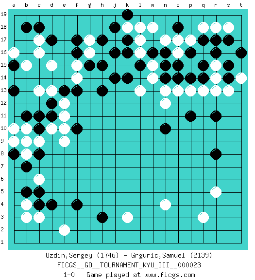 Last move : 1-0 2012 April 12 11:35:32 [Event "FICGS__GO__TOURNAMENT_KYU_III__000023 "] [Site "FICGS"] [Date "2011.12.14"] [Round "1"] [Black "Uzdin,Sergey "] [White "Grguric,Samuel "] [Result "1-0"] [Rating 1 "1746"] [Rating 2 "2139"] 1.r16 r5 2.d17 d15 3.f16 f14 4.h15 d10 5.d4 p17 6.m16 r13 7.q15 r18 8.r11 m18 9.k17 k18 10.j18 l17 11.k19 l18 12.k16 l16 13.l15 g17 14.h17 p13 15.o18 n17 16.o15 o17 17.p11 n13 18.n14 n12 19.r8 q3 20.n10 l13 21.h13 g16 22.g15 k15 23.k14 j15 24.j16 m15 25.j14 m14 26.s15 r14 27.s17 s18 28.s14 s13 29.t16 t14 30.q17 q18 31.p14 q13 32.p16 r15 33.r17 o16 34.q14 c17 35.c18 c16 36.b18 c6 37.f4 k3 38.c8 c3 39.c4 b4 40.d12 e11 41.b5 b3 42.c5 e2 43.h3 c9 44.b7 f15 45.f17 n4 46.a15 b15 47.a13 a16 48.b9 b10 49.b11 a9 50.f13 e12 51.e13 d13 52.c11 c13 53.d11 e9 54.a8 b8 55.f10 e10 56.b9 a10 57.c10 b8 58.n15 b9 59.n16 o13 60.o14 1-0 This go game has been lost on time (started : 2011.12.14 13:56:47) Here are the names of the openings (joseki) played in the four corners : Corner d16 : d17 d15Komoku (Somok, Xiao~mu`) 3-4 Point. The komoku (3-4) point is the traditional corner enclosure move..Ikken Takagakari (Hankan Nop'dakeolch'im, Yi Gaogua`jiao~, 1-Space High Approach). The 5-4 approach move has become more popular in modern times, as modern Go emphasizes speed and influence. Corner q16 : r16 p17Komoku (Somok, Xiao~mu`) 3-4 Point. The komoku (3-4) point is the traditional corner enclosure move..Ikken Kakari (Hankan Keolch'im, Yi Gua`jiao~, 1-Space Low Pincer). The small knight move is the basic approach move to the 3-4 point stone. It has been continually used for over four centuries. There are limitless variations, with new moves constantly being discovered. White 2 opens the door to a treaure store of joseki. Corner q4 : r5 r8Mokuhazushi (Waemok, Wai`mu`) 5-3 Point. The mokuhazushi (5-3) point was popular in the Edo period in Japan (1600 - 1867). It emphasizes influence; territorially, it is inferior to the 3-4 point. Corner d4 : d4 c6Hoshi (Hwajeom, Seongjeom, Xingwei`) 4-4 Point. The star or hoshi (4-4) point, emphasizing influence at the potential expense of territory.Ikken Kakari (Hankan Keolch'im, Yi Gua`jiao~, 1-Space Low Approach). White 2 is the standard approach move to the 4-4. Player Black won this Go (weiqi, baduk) game.Follow this game move after move (download ) Stop on second, extend on third. (Anonymous) The question of whether computers can think is just like question of whether submarines can swim. (Edsger W. Dijkstra)