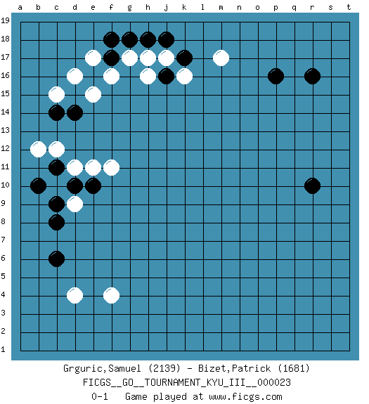 Last move : 0-1 2012 April 2 11:0:15 [Event "FICGS__GO__TOURNAMENT_KYU_III__000023"] [Site "FICGS"] [Date "2011.12.14"] [Round "1"] [Black "Grguric,Samuel"] [White "Bizet,Patrick"] [Result "0-1"] [Rating 1 "2139"] [Rating 2 "1681"] 1.p16 d16 2.d10 d4 3.c14 f16 4.c6 f4 5.r16 c15 6.d14 c10 7.c9 d9 8.c8 d11 9.e10 e11 10.c11 c12 11.b10 b12 12.k17 f11 13.r10 m17 14.f18 g17 15.g18 h17 16.h18 j17 17.j18 k16 18.e16 e17 19.f17 e15 20.j16 h16 0-1 This go game has been lost on time (started : 2011.12.14 13:56:47) Here are the names of the openings (joseki) played in the four corners : Corner d16 : d16 c14 Hoshi (Hwajeom, Seongjeom, Xingwei`) 4-4 Point. The star or hoshi (4-4) point, emphasizing influence at the potential expense of territory. Ikken Kakari (Hankan Keolch'im, Yi Gua`jiao~, 1-Space Low Approach). Black 2 is the standard approach move to the 4-4. Corner d4 : d4 c6 Hoshi (Hwajeom, Seongjeom, Xingwei`) 4-4 Point. The star or hoshi (4-4) point, emphasizing influence at the potential expense of territory. Ikken Kakari (Hankan Keolch'im, Yi Gua`jiao~, 1-Space Low Approach). Black 2 is the standard approach move to the 4-4. Player White won this Go (weiqi, baduk) game. Follow this game move after move (download)Knight's moves win running battles. (Anonymous) Empty your mind, be formless, shapeless — like water. (Bruce Lee)
