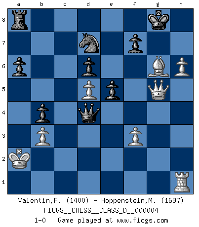 Last move : 1-0 2006 July 11 19:30:52 [Event "FICGS__CHESS__CLASS_D__000004"] [Site "FICGS"] [Date "2006.05.11"] [Round "1"] [White "Valentin,Florea"] [Black "Hoppenstein,Michael"] [Result "1-0"] [WhiteElo "1400"] [BlackElo "1697"] 1.e4 c5 2.Nf3 d6 3.d4 cxd4 4.Nxd4 Nf6 5.Nc3 a6 6.f3 e5 7.Nb3 Be7 8.Be3 Be6 9.Qd2 O-O 10.O-O-O Nbd7 11.g4 Qc7 12.Kb1 Rfc8 13.h4 b5 14.h5 h6 15.g5 b4 16.Nd5 Nxd5 17.exd5 Bf5 18.Rc1 Bxg5 19.Bxg5 hxg5 20.Qxg5 Bxc2+ 21.Ka1 Qb6 22.Rxc2 Rxc2 23.Bd3 Rxb2 24.h6 g6 25.Bxg6 Rxb3 26.axb3 Qd4+ 27.Ka2 1-0 Sicilian : Najdorf Kingside Castling by player Black (move 9) Queenside Castling by player White (move 10) Player White won this chess game. Follow this game move after move (download)Man is a frivolous, a specious creature, and like a Chess player, cares more for the process of attaining his goal than for the goal itself. (Dostoyevsky) Wenn Dein Gegner dir ein Remis anbietet, versuch herauszufinden, weshalb er glaubt schlechter zu stehen. (Nigel Short) Un mal día en el Ajedrez, es mejor que cualquier buen día en el trabajo. (Anonymous) A ce moment-là, je menaçais de comprendre la position ! (Clément L'Heureux) Just because you do not take an interest in politics doesn't mean politics won't take an interest in you. (Pericles 430 B.C.)