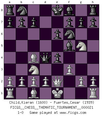 Last move : 1-0 2007 February 22 23:33:32 [Event "FICGS__CHESS__THEMATIC_TOURNAMENT__000021"] [Site "FICGS"] [Date "2007.01.10"] [Round "1"] [White "Child,Kieran"] [Black "Fuertes,Cesar"] [Result "1-0"] [WhiteElo "1600"] [BlackElo "1939"] 1.Nf3 d5 2.e4 dxe4 3.Ng5 Bf5 4.Nc3 Nf6 5.Bc4 e6 6.f3 Qd4 7.Qe2 1-0 This chess game has been lost on time (started : 2007.01.10 16:30:23) Tennison (Lemberg, Zukertort) gambit Player White won this chess game. Follow this game move after move (download)Robert Fischer is a law unto himself. (Larry Evans) Ein bischen Romantik kann weder im Schach noch in der Liebe schaden. Also versuche ich mich ab und zu daran zu erinnern. (Nigel Short) Aquellos que dicen entender al Ajedrez, no entienden nada. (Robert Hubner) Fischer est le meilleur joueur du monde et Karpov n'est qu'un joueur de bistrot. (Garry Kasparov, agé de 16 ans) I think your argument is specious - I think your tie is ugly. (Gregory House to Dr. Foreman, House M.D.)