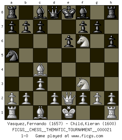 Last move : 1-0 2007 March 17 2:6:51 [Event "FICGS__CHESS__THEMATIC_TOURNAMENT__000021"] [Site "FICGS"] [Date "2007.01.10"] [Round "1"] [White "Vasquez,Fernando"] [Black "Child,Kieran"] [Result "1-0"] [WhiteElo "1657"] [BlackElo "1600"] 1.Nf3 d5 2.e4 dxe4 3.Ng5 Nf6 4.Bc4 e6 5.Nc3 Qd4 6.Qe2 Nc6 7.Ncxe4 h6 8.c3 Qd8 9.Nf3 Na5 10.Nxf6+ 1-0 This chess game has been lost on time (started : 2007.01.10 16:30:23) Tennison (Lemberg, Zukertort) gambit Player White won this chess game. Follow this game move after move (download)Chess is a part of culture and if a culture is declining then Chess too will decline. (Mikhail Botvinnik) Ich würde mich als ganz normalen Jungen bezeichnen [Im Alter von 12]. (Sergej Karjakin) El Ajedrez es un regaderazo frío para la mente. (Sir John Simon) Tous ces prétendus hommes politiques sont les pions, les Cavaliers, les Tours ou les Fous d'une partie d'échecs qui se jouera tant qu'un hasard ne renversera pas l'échiquier. (Honoré de Balzac) Any activity becomes creative when the doer cares about doing it right or doing it better. (John Updike)