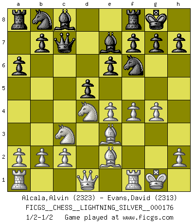 Last move : 1/2-1/2 2011 December 14 16:58:50 [Event "FICGS__CHESS__LIGHTNING_SILVER__000176"] [Site "FICGS"] [Date "2011.12.14"] [Round "1"] [White "Alcala,Alvin"] [Black "Evans,David"] [Result "1/2-1/2"] [WhiteElo "2323"] [BlackElo "2313"] 1.e4 c5 2.Nf3 d6 3.d4 cxd4 4.Nxd4 Nf6 5.Nc3 a6 6.Be2 e6 7.f4 Be7 8.Be3 Qc7 9.O-O O-O 10.g4 d5 1/2-1/2 Sicilian : Najdorf, Opovcensky variation Kingside Castling by player White (move 9) Kingside Castling by player Black (move 9) This chess game ended in a draw. Follow this game move after move (download)Without error there can be no brilliancy. (Emanuel Lasker) Ich hatte Angst gegen einen russischen Großmeister zu verlieren, und er befürchtete gegen einen kleinen Jungen zu verlieren. (über ein Remis gegen Juri Awerbach). (Robert James Fischer) Puntos débiles o agujeros en la posición de tu oponente deben de ser ocupados por piezas, no Peones. (Siegbert Tarrasch) Des combinaisons [dans le jeu d'échecs] pareilles à des mélodies. Je crois entendre pour ainsi dire la musique des coups... (Vladimir Nabokov) I've lost money so fast in these clubs it's left me reeling. I've read every poker book ever written, but the only way to get better at the game is to go out and play with people who are really good. The problem is, you stand to lose a lot of money doing it. (Matt Damon)