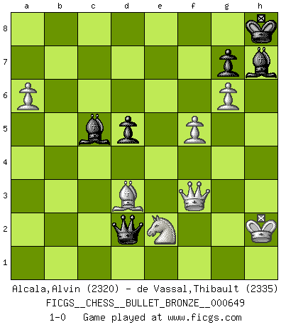 Last move : 1-0 2011 December 14 17:32:46 [Event "FICGS__CHESS__BULLET_BRONZE__000649"] [Site "FICGS"] [Date "2011.12.14"] [Round "1"] [White "Alcala,Alvin"] [Black "de Vassal,Thibault"] [Result "1-0"] [WhiteElo "2320"] [BlackElo "2335"] 1.e4 c5 2.Nf3 d6 3.d4 cxd4 4.Nxd4 Nf6 5.Nc3 a6 6.Be3 e5 7.Nb3 Be6 8.f3 h5 9.Qd2 Be7 10.Be2 Nbd7 11.Nd5 Nxd5 12.exd5 Bf5 13.O-O O-O 14.Na5 Qc7 15.c4 h4 16.b4 e4 17.f4 Rfe8 18.Rac1 Rac8 19.h3 Qb8 20.Nb3 Nf6 21.Rfe1 Bd8 22.Bd1 Qc7 23.a4 Qd7 24.a5 Be7 25.Nd4 Bh7 26.Bf2 Rb8 27.Bc2 Rec8 28.Bb1 Rc7 29.b5 Ra8 30.Bxh4 Rac8 31.Bf2 axb5 32.cxb5 Nxd5 33.f5 Rxc1 34.Rxc1 Rxc1+ 35.Qxc1 e3 36.Bxe3 Bd8 37.a6 bxa6 38.bxa6 Nxe3 39.Qxe3 Bb6 40.Kh2 d5 41.g3 Ba7 42.Bd3 Kh8 43.Qf4 Qa4 44.Ne2 Qb3 45.Qf3 Qa2 46.h4 Bc5 47.g4 f6 48.g5 fxg5 49.hxg5 Qd2 50.g6 1-0 Sicilian : Najdorf, Byrne (English) attack Kingside Castling by player White (move 13) Kingside Castling by player Black (move 13) Player White won this chess game. Follow this game move after move (download)When you don't know what to do, wait for your opponent to get an idea - it's sure to be wrong. (Tarrasch) Smyslow ist ein Beweis dafür, dass ich noch zehn Jahre spielen kann! [der 75 jährige über den 85 jährigen] (Viktor Kortschnoi) En el tablero, la mentira e hipocresía no sobreviven mucho. (Emanuel Lasker) Fischer est le meilleur joueur du monde et Karpov n'est qu'un joueur de bistrot. (Garry Kasparov, agé de 16 ans) This is where the fun begins. (Anakin Skywalker in Star Wars ep.3)