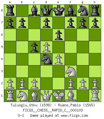 Last move : 0-1 2012 February 16 7:46:48 [Event "FICGS__CHESS__RAPID_C__000103"] [Site "FICGS"] [Date "2011.12.15"] [Round "1"] [White "Tuluoglu,Utku"] [Black "Ruano,Pablo"] [Result "0-1"] [WhiteElo "1598"] [BlackElo "1565"] 1.e4 c5 2.Nf3 e6 3.d4 Nc6 4.d5 Nd4 0-1 This chess game has been lost on time (started : 2011.12.15 0:2:23) Sicilian defense Player Black won this chess game. Follow this game move after move (download)The chessboard is the world, the pieces are the phenomena of the Universe, the rules of the game are what we call the laws of Nature and the player on the other side is hidden from us. (Thomas Huxley) Der Umstand, daß uns eine 7 Stunden Zeitkontrolle ermöglicht eine großartige, tiefe Partie zu spielen, ist für die Massenmedien nicht weiter von Bedeutung. (Alexej Shirov) Después de la respuesta de las negras a 1.e4 con 1..e5, se quedan siempre tratando de entrar dentro del juego. (Howard Staunton) Vous n'êtes pas toujours obligé de jouer le meilleur coup. Un coup doit être actif, entreprenant, correct et beau ! (David Bronstein) The right perception of any matter and a misunderstanding of the same matter do not wholly exclude each other. (Kafka's the trial)