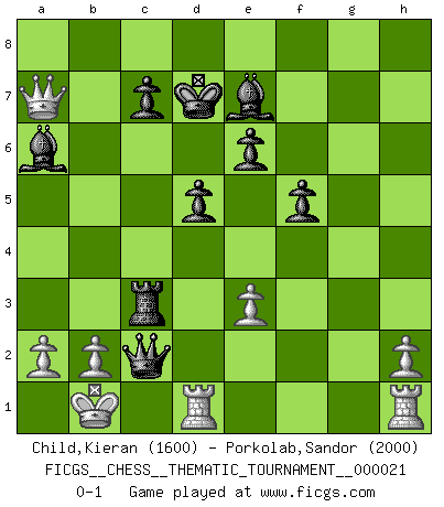 Last move : 0-1 2007 April 13 22:57:0 [Event "FICGS__CHESS__THEMATIC_TOURNAMENT__000021"] [Site "FICGS"] [Date "2007.01.10"] [Round "1"] [White "Child,Kieran"] [Black "Porkolab,Sandor"] [Result "0-1"] [WhiteElo "1600"] [BlackElo "2000"] 1.Nf3 d5 2.e4 dxe4 3.Ng5 e6 4.Nxe4 Nf6 5.Nbc3 Nc6 6.Bb5 Nxe4 7.Nxe4 Qd5 8.Qe2 f5 9.Qh5+ Kd7 10.Qf7+ Be7 11.Bxc6+ bxc6 12.Ng3 Ba6 13.d4 Raf8 14.Qxg7 Rhg8 15.Qxh7 Qxg2 16.d5 cxd5 17.Be3 Rh8 18.Qg7 Rfg8 19.Qd4 Rh4 20.Qxa7 Rxg3 21.O-O-O Rxe3 22.fxe3 Rc4 23.c3 Rxc3+ 24.Kb1 Qc2+ 0-1 Tennison (Lemberg, Zukertort) gambit Queenside Castling by player White (move 21) Player Black won this chess game. Follow this game move after move (download)Let the perfectionist play postal. (Yasser Seirawan) Der Freibauer hat für mich eine Seele, genau wie der Mensch, Wünsche, die unerkannt in ihm schlummern, und Befürchtungen, von deren Existenz er selbst kaum ahnt. (Aaron Nimzowitsch) El jugador táctico debe saber que hacer cuando algo se debe de hacer. El estratégico debe saber que hacer cuando nada se debe de hacer. (Savielly Tartakover) Une platitude souvent récitée à propos des Echecs est qu'une des choses les plus difficiles à réaliser est de gagner une position gagnante. Cela ne manque pas de sens mais, pour ma part, j'ai toujours trouvé plus difficile de gagner une position perdante. (Tim Krabbe) Remember : Your focus determines your reality. (Qui-Gon Jinn in Star Wars ep.1)