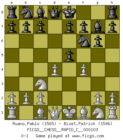 Last move : 0-1 2012 February 19 7:46:42 [Event "FICGS__CHESS__RAPID_C__000103"] [Site "FICGS"] [Date "2011.12.15"] [Round "1"] [White "Ruano,Pablo"] [Black "Bizet,Patrick"] [Result "0-1"] [WhiteElo "1565"] [BlackElo "1546"] 1.d4 Nf6 2.Nc3 g6 3.e4 d6 4.f4 Bg7 5.e5 dxe5 0-1 This chess game has been lost on time (started : 2011.12.15 0:2:23) Queen's pawn game Player Black won this chess game. Follow this game move after move (download)Chess is mental torture. (Garry Kasparov) Das Blackmar-Diemer-Gambit verändert den ganzen Menschen! (Emil Joseph Diemer) Realmente no sabemos como el juego fue inventado, aunque hay sospechas. Tan pronto como descubramos a los culpables, se los haremos saber. (Bruce Pandolfini) Des points faibles ou des trous dans la position de l'adversaire doivent être occupés par des pièces et non pas par des pions. (Siegbert Tarrasch) Memory is a way of holding onto the things you love, the things you are, the things you never want to lose. (from the television show: The Wonder Years)