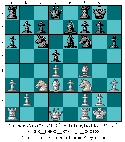 Last move : 1-0 2012 February 10 19:22:5 [Event "FICGS__CHESS__RAPID_C__000103"] [Site "FICGS"] [Date "2011.12.15"] [Round "1"] [White "Mamedov,Nikita"] [Black "Tuluoglu,Utku"] [Result "1-0"] [WhiteElo "1685"] [BlackElo "1598"] 1.d4 Nf6 2.Nf3 e6 3.c4 d5 4.Nc3 Be7 5.Bf4 a6 6.e3 O-O 7.cxd5 exd5 8.Bd3 Nc6 9.O-O Be6 10.h3 h6 11.a3 1-0 This chess game has been lost on time (started : 2011.12.15 0:2:23) Queen's pawn game Kingside Castling by player Black (move 6) Kingside Castling by player White (move 9) Player White won this chess game. Follow this game move after move (download)Chess demands total concentration. (Bobby Fischer) Offener Brief an US-Präsident Bush anlässlich der Verhaftung Bobby Fishers: Verhaften Sie mich. Stecken Sie mich in dieselbe Zelle wie Bobby Fisher und geben Sie uns ein Schachspiel mit. (Boris Vassilievich Spassky) El jugador de combinación piensa hacia adelante; comienza de la posición dada y trabaja las movidas contundentes en su mente. (Emanuel Lasker) Karpov est une pièce de musée. (Garry Kasparov) You can't play chess if you're groggy from pills. (Anatoly Karpov)