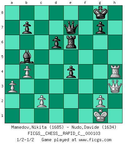 Last move : 1/2-1/2 2012 March 26 4:41:16 [Event "FICGS__CHESS__RAPID_C__000103"] [Site "FICGS"] [Date "2011.12.15"] [Round "1"] [White "Mamedov,Nikita"] [Black "Nudo,Davide"] [Result "1/2-1/2"] [WhiteElo "1685"] [BlackElo "1634"] 1.e4 c5 2.Nf3 Nc6 3.d4 cxd4 4.Nxd4 e5 5.Nb5 Nf6 6.N1c3 Bb4 7.a3 Bxc3+ 8.Nxc3 O-O 9.Bd3 d6 10.h3 h6 11.O-O Bd7 12.Be3 Nd4 13.f4 Bc6 14.b4 a6 15.Qd2 Nb5 16.Bxb5 axb5 17.Qd3 Re8 18.fxe5 Rxe5 19.Bd4 Re6 20.Qg3 Ne8 21.Rf4 Rg6 22.Qf3 f6 23.Qd3 Nc7 24.Rf5 Qd7 25.Bb6 Re8 26.Bxc7 Qxc7 27.Rd1 Qd7 28.Nd5 Qf7 29.Nc3 Re6 30.Rdf1 Qe8 31.R1f4 Rg5 32.Rxg5 hxg5 33.Rg4 Qe7 34.h4 gxh4 35.Rxh4 f5 36.Qh3 fxe4 37.Nxb5 Bxb5 1/2-1/2 Sicilian : Labourdonnais-Loewenthal variation Kingside Castling by player Black (move 8) Kingside Castling by player White (move 11) This chess game ended in a draw. Follow this game move after move (download)Chess is above all, a fight ! (Emanuel Lasker) Schachspieler können ausgezeichnet Varianten am Schachbrett berechnen, aber nicht im realen Leben. Zu stark ist der Individualismus im Schach ausgeprägt, und für viele ist ein kleiner momentaner persönlicher Vorteil wichtiger als ein weit größerer Vorteil von morgen. (Anatoly Karpov) Yo nunca en mi vida he jugado la Defensa Francesa, que viene siendo la más aburrida de todas las Aperturas. (Wilhelm Steinitz) Donnez-moi un Cavalier en 6e et je gagnerais toutes mes parties. (Steinitz) A generalist learns less and less about more and more until he knows nothing about everything. (Author unknown)