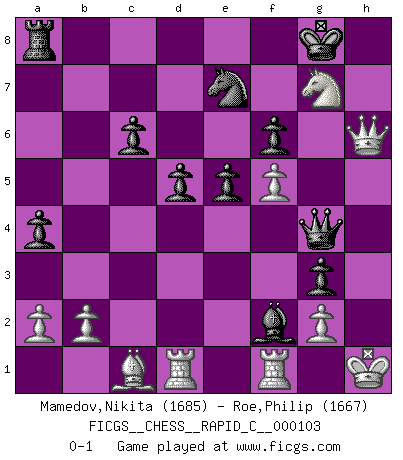 Last move : 0-1 2012 February 23 4:49:33 [Event "FICGS__CHESS__RAPID_C__000103"] [Site "FICGS"] [Date "2011.12.15"] [Round "1"] [White "Mamedov,Nikita"] [Black "Roe,Philip"] [Result "0-1"] [WhiteElo "1685"] [BlackElo "1667"] 1.d4 Nf6 2.c4 Nc6 3.Nc3 e5 4.d5 Ne7 5.e4 Ng6 6.h4 h5 7.Bg5 Bc5 8.Qd2 d6 9.Nge2 c6 10.Ng3 a5 11.Be2 Qb6 12.O-O a4 13.Qc2 Qa5 14.Rad1 Ng4 15.Nf5 f6 16.Bc1 O-O 17.Bxg4 hxg4 18.h5 Bxf5 19.exf5 Ne7 20.dxc6 bxc6 21.Ne4 Bd4 22.Ng3 d5 23.h6 Qc5 24.hxg7 Rf7 25.Qd2 Rxg7 26.Nh5 g3 27.Nxg7 Bxf2+ 28.Kh1 Qxc4 29.Qh6 Qg4 0-1 Kevitz-Trajkovich defense Kingside Castling by player White (move 12) Kingside Castling by player Black (move 16) Player Black won this chess game. Follow this game move after move (download)When you play Bobby, it is not a question if you win or lose. It is a question if you survive. (Boris Spassky) Man wirke der falschen Auffassung entgegen, als ob jeder Zug Unmittelbares zu leisten habe; auch Werte- und Ruhezüge haben ihre Existenzberechtigung. (Aaron Nimzowitsch) El Ajedrez es sobre todo, ¡una pelea!. (Emanuel Lasker) Psychologiquement, tu dois avoir confiance en toi même, mais cette confiance doit être basée sur des faits. (Robert Fischer) Faith : not wanting to know what is true. (Friedrich Nietzsche)