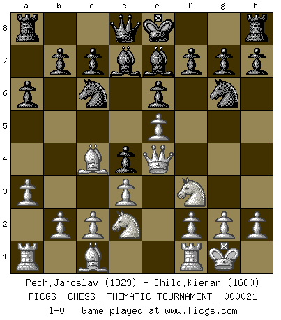 Last move : 1-0 2007 March 18 19:14:48 [Event "FICGS__CHESS__THEMATIC_TOURNAMENT__000021"] [Site "FICGS"] [Date "2007.01.10"] [Round "1"] [White "Pech,Jaroslav"] [Black "Child,Kieran"] [Result "1-0"] [WhiteElo "1929"] [BlackElo "1600"] 1.Nf3 d5 2.e4 e6 3.e5 d4 4.Bc4 Nc6 5.d3 Nge7 6.O-O Ng6 7.Qe2 Be7 8.Qe4 a6 9.Nbd2 Bd7 10.a3 1-0 This chess game has been lost on time (started : 2007.01.10 16:30:23) Tennison (Lemberg, Zukertort) gambit Kingside Castling by player White (move 6) Player White won this chess game. Follow this game move after move (download)The blunders are all there on the board, waiting to be made. (Savielly Tartakover) Matt entspricht nicht immer den Tatsachen. (Savielly Grigorievitsch Tartakower) Si tu oponente no puede hacer nada activo, entonces no apures la posición; En vez de eso, dejalo estar sentado ahí, sufriendo y rogandote por un empate. (Jeremy Silman) Les pièces de l'échiquier étaient impitoyables. Elles le retenaient, elles l'absorbaient. Il y avait de l'horreur en cela, mais aussi une harmonie unique. Car, qu'y a-t-il dans le monde, à part les échecs ? (V. Nabokov) Thus, what is of supreme importance in war is to attack the enemy's strategy. (Sun Tzu)