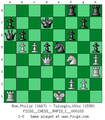 Last move : 1-0 2012 February 15 19:45:46 [Event "FICGS__CHESS__RAPID_C__000103"] [Site "FICGS"] [Date "2011.12.15"] [Round "1"] [White "Roe,Philip"] [Black "Tuluoglu,Utku"] [Result "1-0"] [WhiteElo "1667"] [BlackElo "1598"] 1.e4 c6 2.d4 d5 3.e5 Bf5 4.h4 h5 5.c4 e6 6.Bg5 Qb6 7.Qd2 Bb4 8.Nc3 Ne7 9.c5 Qa5 10.Bxe7 Kxe7 11.Bd3 Bxd3 12.Qxd3 Nd7 13.Nge2 Raf8 14.Nf4 Bxc5 15.dxc5 Nxe5 16.Qd4 f6 17.Rh3 Kd7 18.b4 Qa6 19.a4 b6 20.b5 cxb5 21.Ncxd5 exd5 22.axb5 1-0 This chess game has been lost on time (started : 2011.12.15 0:2:23) Caro-Kann : Advance variation Player White won this chess game. Follow this game move after move (download)Good positions don't win games, good moves do. (Gerald Abrahams) Kein Großmeister ist normal. Sie unterscheiden sich nur im Ausmaß Ihrer Verrücktheit. (Viktor Kortschnoi) Con el tiempo, empecé a progresar en partidas decisivas. Tal vez porque me di cuenta de una simple verdad: no solo estaba yo nervioso sino también mi oponente. (Mikhail Tal) En blitz, le Cavalier l'emporte sur le Fou. (Vlastimil Hort) History is the quarrels of popes and kings, with wars or pestilences in every page; the men all so good for nothing, and hardly any women at all. (Jane Austen)
