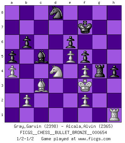 Last move : 1/2-1/2 2011 December 15 15:7:30 [Event "FICGS__CHESS__BULLET_BRONZE__000654"] [Site "FICGS"] [Date "2011.12.15"] [Round "1"] [White "Gray,Garvin"] [Black "Alcala,Alvin"] [Result "1/2-1/2"] [WhiteElo "2398"] [BlackElo "2365"] 1.e4 c5 2.c3 Nf6 3.e5 Nd5 4.d4 cxd4 5.Nf3 Nc6 6.cxd4 d6 7.Bc4 dxe5 8.dxe5 Nb6 9.Qxd8+ Nxd8 10.Bb5+ Bd7 11.Nc3 e6 12.Be2 Rc8 13.O-O Bb4 14.Bd2 Nc4 15.Bxc4 Rxc4 16.a3 Be7 17.Be3 a6 18.Rfd1 f5 19.Rd3 Nf7 20.Rad1 Bc6 21.Bd4 Bxf3 22.gxf3 g5 23.Ne2 Rg8 24.Bc3 Rc8 25.Kg2 Rg6 26.h3 Rd8 27.a4 Bf8 28.Rxd8+ Nxd8 29.f4 g4 30.hxg4 Rxg4+ 31.Kf3 Rh4 32.Nd4 Bc5 33.Ba5 b6 34.Be1 h5 35.Bc3 a5 36.Nb5 Ke7 37.Rg1 Rg4 38.Rh1 h4 39.Nd4 Kf7 1/2-1/2 Sicilian : Alapin's variation (2.c3) Kingside Castling by player White (move 13) This chess game ended in a draw. Follow this game move after move (download)Help your pieces so they can help you. (Paul Morphy) Kritik überlasse ich den Spießern. Ich zeige nichts, wofür ich mich schämen muss. (Alexandra Kosteniuk) Cuando tengas duda... ¡juega al Ajedrez!. (Tevis) Des points faibles ou des trous dans la position de l'adversaire doivent être occupés par des pièces et non pas par des pions. (Siegbert Tarrasch) See no evil, hear no evil, speak no evil. (The 3 monkeys)