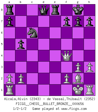 Last move : 1/2-1/2 2011 December 15 18:40:56 [Event "FICGS__CHESS__BULLET_BRONZE__000656"] [Site "FICGS"] [Date "2011.12.15"] [Round "1"] [White "Alcala,Alvin"] [Black "de Vassal,Thibault"] [Result "1/2-1/2"] [WhiteElo "2343"] [BlackElo "2352"] 1.g3 e5 2.c4 Nf6 3.Bg2 Nc6 4.Nc3 Bc5 5.e3 O-O 6.Nge2 d5 7.Nxd5 Nxd5 8.cxd5 Nb4 9.Qb3 c6 10.d4 exd4 11.exd4 Bb6 12.dxc6 Nxc6 13.d5 Ba5+ 14.Kf1 Ne5 15.Be3 Re8 16.h3 b5 17.Nd4 Bd7 18.Kg1 Bb6 19.Nc6 Bxc6 20.dxc6 Bxe3 21.Qxe3 Nxc6 22.Qf4 1/2-1/2 Benko's Opening Kingside Castling by player Black (move 5) This chess game ended in a draw. Follow this game move after move (download)I'm not afraid of Spassky. The world knows I'm the best. You don't need a match to prove it. (Bobby Fischer) Zeige mir drei Eröffnungsvarianten und ich beweise dir, dass zwei davon inkorrekt sind. (Emanuel Lasker) Puntos débiles o agujeros en la posición de tu oponente deben de ser ocupados por piezas, no Peones. (Siegbert Tarrasch) La vie et les Echecs sont tous les deux une lutte constante. (Lasker) That's absurd. I love it. (Gregory House, House M.D.)