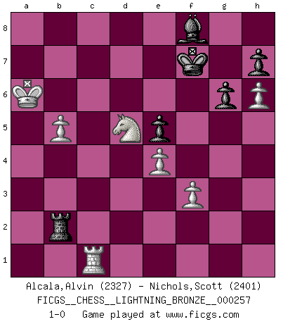 Last move : 1-0 2011 December 16 17:15:32 [Event "FICGS__CHESS__LIGHTNING_BRONZE__000257"] [Site "FICGS"] [Date "2011.12.16"] [Round "1"] [White "Alcala,Alvin"] [Black "Nichols,Scott"] [Result "1-0"] [WhiteElo "2327"] [BlackElo "2401"] 1.e4 c5 2.Nf3 d6 3.d4 cxd4 4.Nxd4 Nf6 5.Nc3 g6 6.Be3 Bg7 7.f3 Nc6 8.Qd2 O-O 9.Bc4 Bd7 10.O-O-O Rc8 11.Bb3 Na5 12.Kb1 Nxb3 13.cxb3 a6 14.g4 b5 15.h4 b4 16.Nce2 a5 17.h5 e5 18.h6 Bh8 19.Nf5 Bxf5 20.gxf5 Rc6 21.Ng3 Qd7 22.Bg5 Rfc8 23.Rhg1 Kf8 24.Nf1 d5 25.Bxf6 Bxf6 26.Qxd5 Qa7 27.fxg6 fxg6 28.Nd2 Rc5 29.Qd3 Rd8 30.Qe2 Rdc8 31.Nc4 a4 32.Qd2 axb3 33.axb3 Kg8 34.Qd7 Qxd7 35.Rxd7 R8c7 36.Rd6 Rf7 37.Rb6 Bd8 38.Rb8 Rf8 39.Rg3 Be7 40.Rxb4 Bh4 41.Rg4 Bd8 42.Rb8 Be7 43.Rb7 Rf7 44.Rg3 Bf8 45.Rb8 Rfc7 46.Rh3 Rf7 47.Ne3 R5c7 48.Nd5 Rb7 49.Nf6+ Kh8 50.Rxb7 Rxb7 51.Kc2 Be7 52.Nd5 Bd6 53.Kc3 Rb8 54.b4 Kg8 55.Rh1 Bf8 56.Kc4 Rc8+ 57.Kb5 Rc2 58.Ka6 Rxb2 59.b5 Kf7 60.Rc1 1-0 Sicilian : Dragon, Yugoslav attack Kingside Castling by player Black (move 8) Queenside Castling by player White (move 10) Player White won this chess game. Follow this game move after move (download)Chess is the gymnasium of the mind. (Blaise Pascal) Dass jemand wie Surab Asmaiparaschwili, der selbst Elopunkte gekauft hat , Vize-Präsident der Fide werden konnte, sagt schon einges über den Zustand dieser Organisation aus. (Joel Lautier) Uno no tiene que jugar muy bien, es suficiente jugar mejor que el oponente. (Siegbert Tarrasch) Un footballeur joue avec ses pieds, parfois avec sa tête. Un joueur d'échecs ne joue qu'avec sa tête. Et quand il ne joue plus, il meurt. (Jacob Murray) The best weapon against an enemy is another enemy. (Friedrich Nietzsche)