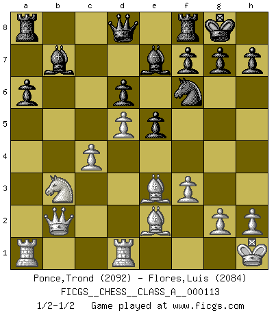 Last move : 1/2-1/2 2012 April 8 16:54:47 [Event "FICGS__CHESS__CLASS_A__000113"] [Site "FICGS"] [Date "2011.12.17"] [Round "1"] [White "Ponce,Trond"] [Black "Flores,Luis"] [Result "1/2-1/2"] [WhiteElo "2092"] [BlackElo "2084"] 1.e4 c5 2.Nf3 d6 3.d4 cxd4 4.Nxd4 Nf6 5.Nc3 a6 6.Be2 e5 7.Nb3 Be7 8.O-O O-O 9.Kh1 b6 10.Be3 Bb7 11.f3 b5 12.Qd2 Nbd7 13.Rfd1 b4 14.Nd5 Nxd5 15.exd5 Nf6 16.a3 bxa3 17.c4 axb2 18.Qxb2 Rb8 19.Ba7 Ra8 20.Be3 Rb8 21.Ba7 Ra8 22.Be3 1/2-1/2 Sicilian : Najdorf, Opovcensky variation Kingside Castling by player White (move 8) Kingside Castling by player Black (move 8) This chess game ended in a draw. Follow this game move after move (download)My opponents make good moves too. Sometimes I don't take these things into consideration. (Bobby Fischer) Mit Schach schule ich mein Gefühl für Geometrie, was für Tennis und Schach gleichermaßen wichtig ist. (Boris Becker) Cuando le juegas a Fischer, no es una cuestion de si vas a ganar o perder. Es una cuestion de si vas a sobrevivir. (Boris Spassky) J'apprécie les joueurs d'est-indienne, c'est grâce à eux que je nourris ma famille depuis tant d'années. (Petrosian) There are more things in heaven and earth than practically anywhere else. (Unknown)