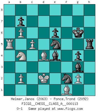 Last move : 0-1 2012 November 1 1:47:25 [Event "FICGS__CHESS__CLASS_A__000113"] [Site "FICGS"] [Date "2011.12.17"] [Round "1"] [White "Helmer,Janos"] [Black "Ponce,Trond"] [Result "0-1"] [WhiteElo "2063"] [BlackElo "2092"] 1.d4 d5 2.Nf3 Nf6 3.Bf4 c5 4.e3 Nc6 5.c3 Qb6 6.Qb3 c4 7.Qxb6 axb6 8.Na3 Na7 9.Nc2 Bf5 10.Nb4 e6 11.a3 h6 12.Be2 Be7 13.Ne5 g5 14.Bg3 h5 15.h4 g4 16.f3 Rg8 17.Bf4 Nb5 18.Kd2 Nd6 19.Nc2 b5 20.Nb4 Nh7 21.e4 dxe4 22.fxg4 hxg4 23.h5 Nf8 24.a4 f6 25.axb5 Rxa1 26.Rxa1 fxe5 27.dxe5 e3+ 28.Bxe3 Ne4+ 29.Ke1 Nd7 30.Bxc4 Nxe5 31.Be2 Bh4+ 32.Kd1 Kf7 33.Bd4 Nf2+ 34.Kd2 Rd8 35.Ra7 Be4 36.Bf1 Kf6 37.b6 Rh8 38.Ra5 Rxh5 39.c4 Bg3 40.c5 Kg6 0-1 Queen's Bishop game Player Black won this chess game. Follow this game move after move (download)A thorough understanding of the typical mating continuations makes the most complicated sacrificial combinations leading up to them not only not difficult, but almost a matter of course. (Siegbert Tarrasch) Gewinnen beim Schach fördert das Selbstvertrauen. Beim Sex spüre ich sowas nicht... (Garry Kasparov) Un jugador que trata de regresar una movida en el Ajedrez es un futuro carterista. (Richard Fenton) Le thème de l'attaque double intervient d'une manière ou d'une autre dans l'immense majorité des combinaisons. (Youri Averbakh) When you stop learning you start dying. (M. Scott Adams)