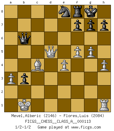 Last move : 1/2-1/2 2012 May 27 12:15:7 [Event "FICGS__CHESS__CLASS_A__000113"] [Site "FICGS"] [Date "2011.12.17"] [Round "1"] [White "Mevel,Alberic"] [Black "Flores,Luis"] [Result "1/2-1/2"] [WhiteElo "2146"] [BlackElo "2084"] 1.e4 c5 2.Nf3 d6 3.d4 cxd4 4.Nxd4 Nf6 5.Nc3 a6 6.Be3 e5 7.Nb3 Be6 8.f3 Be7 9.Qd2 O-O 10.O-O-O Nbd7 11.g4 b5 12.g5 b4 13.Ne2 Ne8 14.f4 a5 15.f5 a4 16.Nbd4 exd4 17.Nxd4 b3 18.Kb1 bxc2+ 19.Nxc2 Bb3 20.axb3 axb3 21.Na3 Ne5 22.h4 Ra4 23.Bd4 Nf3 24.Qc3 Nxd4 25.Rxd4 Rxd4 26.Qxd4 d5 27.Qxd5 Qb6 28.Bc4 Bxa3 29.bxa3 1/2-1/2 Sicilian : Najdorf, Byrne (English) attack Kingside Castling by player Black (move 9) Queenside Castling by player White (move 10) This chess game ended in a draw. Follow this game move after move (download)Half the variations which are calculated in a tournament game turn out to be completely superfluous. Unfortunately, no one knows in advance which half. (Jan Tinman) Deine Wertungszahl - vorausgesetzt einige Jahre schachliche Anstrengung - entspricht etwa dem zehnfachen Deines IQ plus 1000. (Jonathan Levitt) La enorme capacidad mental, en la que sin ella no puede un jugador de Ajedrez existir, es demasiado requerida por el Ajedrez al grado de que nunca podrá liberar su mente de este juego. (Albert Einstein) Il n'y a pas de prix trop élevé au scalp de l'ennemi. (Koblentz) Art is not a thing, it is a way. (Elbert Hubbard)