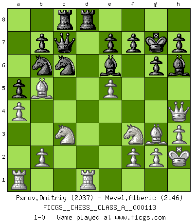 Last move : 1-0 2012 March 30 9:45:14 [Event "FICGS__CHESS__CLASS_A__000113"] [Site "FICGS"] [Date "2011.12.17"] [Round "1"] [White "Panov,Dmitriy"] [Black "Mevel,Alberic"] [Result "1-0"] [WhiteElo "2037"] [BlackElo "2146"] 1.e4 c5 2.c3 Nf6 3.e5 Nd5 4.d4 cxd4 5.cxd4 d6 6.Nf3 Nc6 7.Bc4 Nb6 8.Bb5 Bd7 9.Nc3 dxe5 10.dxe5 g6 11.O-O Bg7 12.Qe2 O-O 13.Rd1 Qc7 14.a4 a5 15.h3 Be6 16.Bf4 Rfd8 17.Bg3 Bh6 18.Qe4 Kg7 19.Kh2 Rac8 20.Qh4 1-0 Sicilian : Alapin's variation (2.c3) Kingside Castling by player White (move 11) Kingside Castling by player Black (move 12) Player White won this chess game. Follow this game move after move (download)Why must I lose to this idiot ? (Aron Nimzovich) Mutter, ich bin eben Ex-Weltmeister geworden. --beim nach Hause Kommen nach dem Verlust des WM-Titels an Mihail Botvinnik -- (Mikhail Nekhemyevich Tal) El Ajedrez es parte de la cultura, y si una cultura esta en decadencia, entonces también el Ajedrez declinará. (Mikhail Botvinnik) Je ne crois pas en la psychologie, je crois aux bons coups. (Robert Fischer) A belief is an idea the mind possesses, an idea that possesses the mind. (Robert Oxden Bolton)