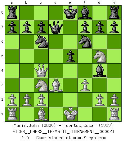 Last move : 1-0 2007 February 23 5:39:4 [Event "FICGS__CHESS__THEMATIC_TOURNAMENT__000021"] [Site "FICGS"] [Date "2007.01.10"] [Round "1"] [White "Marin,John"] [Black "Fuertes,Cesar"] [Result "1-0"] [WhiteElo "0800"] [BlackElo "1939"] 1.Nf3 d5 2.e4 dxe4 3.Ng5 Bf5 4.Nc3 Nf6 5.d3 Bg4 6.Qd2 exd3 7.Bxd3 Nc6 8.Qf4 e5 9.Qc4 Qd7 10.f3 1-0 This chess game has been lost on time (started : 2007.01.10 16:30:23) Tennison (Lemberg, Zukertort) gambit Player White won this chess game. Follow this game move after move (download)The Pin is mightier than the sword. (Fred Reinfeld) Wer nie einen Fehler gemacht hat, hat nie etwas Neues ausprobiert. (Albert Einstein) Aquel que ve no otra dirección en el juego que la de dar Jaque Mate a su oponente, nunca será un buen jugador de Ajedrez. (Euwe) Le pion, dans sa simplicité, marche droit devant lui, mais lorsqu'il prend, il le fait obliquement? Ainsi l'homme, tant qu'il reste pauvre, marche dans la droiture et vit honnêtement, mais lorsqu'il recherche les honneurs, il flatte, se parjure et, par les voies obliques, cherche une position supérieure sur l'échiquier du monde. (Jean de Galles) He is a liar. I just don't know what the lie is yet. (Horatio Caine, C.S.I. Miami)