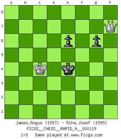 Last move : 1-0 2012 January 1 16:33:48 [Event "FICGS__CHESS__RAPID_A__000119"] [Site "FICGS"] [Date "2011.12.19"] [Round "1"] [White "James,Angus"] [Black "Riha,Josef"] [Result "1-0"] [WhiteElo "1937"] [BlackElo "1945"] 1.e4 c5 2.Nf3 d6 3.d4 cxd4 4.Nxd4 Nf6 5.Nc3 a6 6.Be3 e6 7.f3 b5 8.Qd2 Bb7 9.g4 Nfd7 10.O-O-O Nb6 11.Nb3 Nc6 12.Qf2 Nd7 13.g5 Nce5 14.Kb1 Qc7 15.Rg1 Rc8 16.f4 b4 17.Nd5 exd5 18.fxe5 dxe4 19.exd6 Bxd6 20.Qd2 Be5 21.Na5 Bd5 22.Bh3 Be6 23.Bxe6 fxe6 24.Rgf1 Bxh2 25.b3 Rb8 26.Nc4 Rb5 27.Qd4 Nc5 28.Rd2 Bg3 29.Rg2 Rf8 30.Rxf8+ Kxf8 31.Rxg3 Nxb3 32.Qd6+ Qxd6 33.Nxd6 Na5 34.Nxb5 axb5 35.Rg4 Nc4 36.Rxe4 Kf7 37.Rf4+ Kg6 38.Rxc4 bxc4 39.c3 bxc3 40.a4 Kf5 41.a5 Ke4 42.a6 Kxe3 43.Kc2 Kf4 44.a7 Kxg5 45.a8Q g6 46.Kxc3 Kf4 47.Kxc4 Ke5 48.Qh8+ Ke4 49.Qxh7 1-0 Sicilian : Najdorf, Byrne (English) attack Queenside Castling by player White (move 10) 10 pieces endgame at move 39 : White KBPP , Black KPPPPP WHITE : King + 1 Bishop 2 Pawns BLACK : King + 5 Pawns 9 pieces endgame at move 42 : White KPP , Black KPPPPP WHITE : King + 2 Pawns BLACK : King + 5 Pawns 8 pieces endgame at move 44 : White KP , Black KPPPPP WHITE : King + 1 Pawn BLACK : King + 5 Pawns Promotion Queen by player White (move 45) 7 pieces endgame at move 46 : White KQ , Black KPPPP WHITE : King + 1 Queen BLACK : King + 4 Pawns 6 pieces endgame at move 47 : White KQ , Black KPPP WHITE : King + 1 Queen BLACK : King + 3 Pawns 5 pieces endgame at move 49 : White KQ , Black KPP WHITE : King + 1 Queen BLACK : King + 2 Pawns Player White won this chess game. Follow this game move after move (download)Dazzling combinations are for the many, shifting wood is for the few. (Georg Kieninger) Ich tröste mich mit dem Vergnügen, daß Schachfans, Zuschauer und Leser glücklich sind, wenn ein Großmeister etwas riskiert, statt nur Klötzchen zu schieben. (Mikhail Nekhemyevich Tal) El Ajedrez, como cualquier otra actividad creativa, puede existir solo a través de méritos combinados de aquellos que tienen talento creativo y de aquellos que tienen la habilidad de organizar un trabajo creativo. (Mikhail Botvinnik) Le plus grand jeu de l'esprit jamais inventé, plus vous l'apprenez, plus vous y prenez du plaisir. (Garry Kasparov) Rules and bones are meant to be broken. (Anonymous)