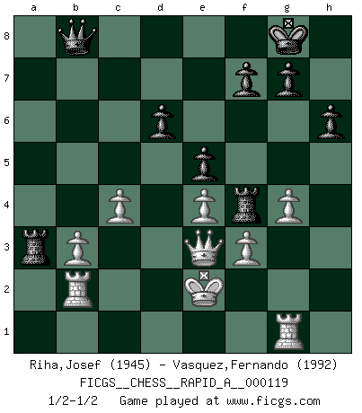 Last move : 1/2-1/2 2012 March 31 3:43:45 [Event "FICGS__CHESS__RAPID_A__000119"] [Site "FICGS"] [Date "2011.12.19"] [Round "1"] [White "Riha,Josef"] [Black "Vasquez,Fernando"] [Result "1/2-1/2"] [WhiteElo "1945"] [BlackElo "1992"] 1.e4 e5 2.Nc3 Nf6 3.g3 Bc5 4.Bg2 Nc6 5.Nf3 d6 6.d3 O-O 7.Na4 Bb6 8.Nxb6 axb6 9.O-O h6 10.Re1 Re8 11.d4 Bg4 12.d5 Nd4 13.Qd3 Nxf3+ 14.Bxf3 Bxf3 15.Qxf3 b5 16.Bd2 c6 17.dxc6 bxc6 18.Qf5 Re6 19.a3 Qc7 20.Rad1 c5 21.h4 Qc6 22.Re2 Ra4 23.Rde1 Rc4 24.Bc1 Rd4 25.f3 b4 26.axb4 Rxb4 27.h5 c4 28.Rd1 Ra4 29.Kh2 Ra1 30.Re3 Qb6 31.Re2 Qc7 32.Kh3 Qc6 33.Re3 Qb6 34.Re2 Nd7 35.Qg4 Qc6 36.Re3 Qa4 37.Re2 Nf6 38.Qf5 Qb5 39.Rf2 Nd7 40.Qg4 Ra2 41.Qh4 c3 42.b3 Nc5 43.Qd8+ Kh7 44.Be3 Qc6 45.Bxc5 Qxc5 46.Kg2 Rf6 47.Qb8 Qe3 48.Rdf1 Qg5 49.Qc7 Qxh5 50.Qxc3 Rg6 51.Qe3 Qh4 52.g4 Qd8 53.c4 Ra3 54.Rb2 Kg8 55.Rh1 Qc8 56.Kf2 Rf6 57.Ke2 Qb8 58.Rhb1 Rf4 59.Rg1 1/2-1/2 Vienna : Paulsen-Mieses variation Kingside Castling by player Black (move 6) Kingside Castling by player White (move 9) This chess game ended in a draw. Follow this game move after move (download)I'm not afraid of Spassky. The world knows I'm the best. You don't need a match to prove it. (Bobby Fischer) Über Frauen: Chess is better. (Robert James Fischer) Un entendimiento minucioso de las típicas continuaciones de mate hacen de las mas complicadas combinaciones de sacrificio que conducen hacia ellas no solo no dificiles, sino casi un asunto de rutina. (Siegbert Tarrasch) On est toujours la mazette de quelqu'un d'autre. (Anonyme) Always two there are. No more no less. A master, and an apprentice. (Master Yoda in Star Wars ep.1)