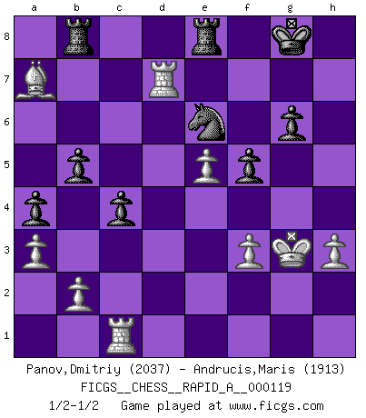 Last move : 1/2-1/2 2012 January 26 22:12:48 [Event "FICGS__CHESS__RAPID_A__000119"] [Site "FICGS"] [Date "2011.12.19"] [Round "1"] [White "Panov,Dmitriy"] [Black "Andrucis,Maris"] [Result "1/2-1/2"] [WhiteElo "2037"] [BlackElo "1913"] 1.e4 e5 2.Nf3 Nf6 3.Nc3 Nc6 4.Bb5 Bd6 5.Bxc6 dxc6 6.O-O O-O 7.Qe2 Bg4 8.d3 Nd7 9.h3 Bh5 10.Nd1 Qf6 11.g4 Bg6 12.Ne3 Nc5 13.Nf5 Ne6 14.c3 Qd8 15.Be3 c5 16.Rad1 Re8 17.Rfe1 h6 18.Qc2 b6 19.Qa4 a5 20.Kg2 Qf6 21.Qb5 a4 22.a3 Bf8 23.d4 exd4 24.cxd4 cxd4 25.N3xd4 Nc5 26.f3 Bxf5 27.Nxf5 Nb3 28.Re2 g6 29.Nxh6+ Bxh6 30.g5 Bxg5 31.Qxg5 Qxg5+ 32.Bxg5 Re6 33.Rd7 c5 34.Re1 Rae8 35.Ra7 f6 36.Bf4 f5 37.e5 b5 38.Rd7 Rb6 39.Bg3 Nd4 40.Rc1 Ne6 41.Bf2 R6b8 42.Kg3 c4 43.Ba7 1/2-1/2 Petrov Three knights game Kingside Castling by player White (move 6) Kingside Castling by player Black (move 6) This chess game ended in a draw. Follow this game move after move (download)A big shock; the best chess player in history has passed away. (Lajos Portisch, about Bobby Fischer's death) Karpov ist ein Museumsstück. (Garry Kasparov) Una compensación adecuada por un sacrificio es tener una combinación sólida que conduce a una posición ganadora; una compensación adecuada por una metida de pata es dejar a tu oponente arrebatar una derrota de las fauces de la victoria. (Bruce A. Moon) La tactique, c'est ce que vous faites quand il y a quelque chose à faire; la stratégie, c'est ce que vous faites quand il n'y a rien à faire. (Savielli Tartacower) Life is verb, not a noun. (Charlotte Perkins Gilman)