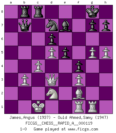 Last move : 1-0 2012 March 26 11:53:21 [Event "FICGS__CHESS__RAPID_A__000119"] [Site "FICGS"] [Date "2011.12.19"] [Round "1"] [White "James,Angus"] [Black "Ould Ahmed,Samy"] [Result "1-0"] [WhiteElo "1937"] [BlackElo "1947"] 1.e4 c5 2.Nf3 d6 3.d4 cxd4 4.Nxd4 Nf6 5.Nc3 a6 6.Be3 e5 7.Nb3 Be6 8.f3 Be7 9.Qd2 Nbd7 10.g4 O-O 11.g5 Nh5 12.O-O-O b5 13.Nd5 Bxd5 14.exd5 f6 15.h4 Ng3 16.Rg1 Nxf1 17.Rdxf1 a5 18.Qd3 a4 19.Nd2 f5 20.Qxb5 Qc7 21.h5 Rfc8 22.Qd3 f4 23.Bf2 Rab8 24.c4 Qb7 25.b3 axb3 26.axb3 1-0 Sicilian : Najdorf, Byrne (English) attack Kingside Castling by player Black (move 10) Queenside Castling by player White (move 12) Player White won this chess game. Follow this game move after move (download)By this measure (on the gap between Fischer & his contemporaries), I consider him the greatest world champion. (Garry Kasparov) Du kannst im Schach nur gut werden, wenn du das Spiel liebst. (Robert James Fischer) Fischer era un maestro de claridad y un Rey del posicionamiento astuto. Sus oponentes podían ver hacia donde se dirigía pero eran impotentes para detenerlo. (Bruce Pandolfini) Les échecs sont un jeu par leur forme, un art par leur essence et une science par sa difficulté d'acquisition. Ils peuvent vous procurer autant de plaisir qu'un bon livre ou une belle musique, mais vous n'aurez une réelle joie que si vous arrivez à bien jouer. (Tigran Petrosian) Wisdom begins at the end. (Daniel Webster)