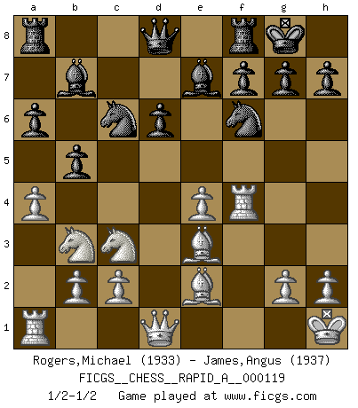 Last move : 1/2-1/2 2011 December 30 15:11:58 [Event "FICGS__CHESS__RAPID_A__000119"] [Site "FICGS"] [Date "2011.12.19"] [Round "1"] [White "Rogers,Michael"] [Black "James,Angus"] [Result "1/2-1/2"] [WhiteElo "1933"] [BlackElo "1937"] 1.e4 c5 2.Nf3 d6 3.d4 cxd4 4.Nxd4 Nf6 5.Nc3 a6 6.Be2 e5 7.Nb3 Be7 8.O-O O-O 9.Kh1 Nc6 10.f4 b5 11.a4 Bb7 12.Be3 exf4 13.Rxf4 Ne5 14.Qd4 Nc6 15.Qd1 Ne5 16.Qd4 Nc6 17.Qd1 1/2-1/2 Sicilian : Najdorf, Opovcensky variation Kingside Castling by player White (move 8) Kingside Castling by player Black (move 8) This chess game ended in a draw. Follow this game move after move (download)Don't even mention losing to me. I can't stand to think of it. (Bobby Fischer) Ich hatte meine größten Erfolge, als ich 47 Jahre alt war. Kasparow war noch nicht mal 42 und hat das Schach schon im Stich gelassen. (Viktor Kortschnoi) Cuando no sepas que mover, espera por una idea que se le venga a la la cabeza de tu oponente. Tenlo por seguro de que esa idea estará incorrecta. (Siegbert Tarrasch) Ce qui caractérise les parties de combat, c'est que si le défenseur a constamment de difficiles problèmes à résoudre, l'attaquant doit chercher sans relâche de nouvelles possibilités d'attaque. (Koblentz) The next best thing to gambling and winning is gambling and loosing. (Nick Dandalos)