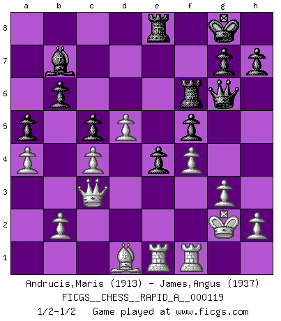 Last move : 1/2-1/2 2012 January 15 22:45:32 [Event "FICGS__CHESS__RAPID_A__000119"] [Site "FICGS"] [Date "2011.12.19"] [Round "1"] [White "Andrucis,Maris"] [Black "James,Angus"] [Result "1/2-1/2"] [WhiteElo "1913"] [BlackElo "1937"] 1.e4 c5 2.Nc3 a6 3.Nf3 d6 4.d4 cxd4 5.Nxd4 Nf6 6.Be2 e5 7.Nb3 Be7 8.Qd3 Be6 9.Nd5 O-O 10.O-O Nxd5 11.exd5 Bc8 12.Be3 Nd7 13.c4 a5 14.a4 f5 15.f4 e4 16.Qc2 Nc5 17.Nxc5 dxc5 18.g3 b6 19.Bd2 Bf6 20.Bc3 Bd4+ 21.Kg2 Qf6 22.Qd2 Bb7 23.Rad1 Bxc3 24.Qxc3 Qg6 25.Rde1 Rae8 26.Bd1 Rf6 1/2-1/2 Sicilian : Closed Kingside Castling by player Black (move 9) Kingside Castling by player White (move 10) This chess game ended in a draw. Follow this game move after move (download)Winning isn't everything... but losing is nothing. (Mednis) Schach ist ein Kampf gegen den Fehler. (Johannes Herrman Zukertort) Un juego de Ajedrez es un dialogo, una conversación entre un jugador y su oponente. Cada movimiento del oponente puede contener amenazas o tropiezos, pero un jugador no se puede defender de las amenazas o tomar ventaja de los tropiezos si es que no se pregunta a sí mismo: ¿Que es lo que mi oponente va a hacer después de cada movida?. (Bruce A. Moon) Je ne crois pas en la psychologie, je crois aux bons coups. (Robert Fischer) No enterprise is more likely to succeed than one concealed from the enemy until it is ripe for execution. (Niccolo Machiavelli)