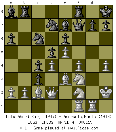 Last move : 0-1 2012 March 26 10:38:26 [Event "FICGS__CHESS__RAPID_A__000119"] [Site "FICGS"] [Date "2011.12.19"] [Round "1"] [White "Ould Ahmed,Samy"] [Black "Andrucis,Maris"] [Result "0-1"] [WhiteElo "1947"] [BlackElo "1913"] 1.e4 e6 2.d4 d5 3.Nc3 Nf6 4.e5 Nfd7 5.f4 c5 6.Nf3 Nc6 7.Be3 Be7 8.Qd2 O-O 9.Be2 a6 10.O-O b5 11.Nd1 f5 12.c3 Qe8 13.Nf2 Bb7 14.Rab1 Qg6 15.h3 Rab8 16.Kh2 c4 17.Rg1 b4 18.g4 Ba8 19.gxf5 Qxf5 20.Rbf1 Kh8 21.Bd1 Qb1 22.Bb3 Qf5 23.Bc2 Qf7 24.h4 bxc3 0-1 This chess game has been lost on time (started : 2011.12.19 5:27:8) French : Steinitz, Boleslavsky variation Kingside Castling by player Black (move 8) Kingside Castling by player White (move 10) Player Black won this chess game. Follow this game move after move (download)Chess teaches you to control the initial excitement you feel when you see something that looks good and it trains you to think objectively when you're in trouble. (Stanley Kubrick) Wie, soll nun auch die Opposition abgeschafft werden? Ja, es tut mir leid, Ihnen diesen Schmerz nicht ersparen zu können. (Aaron Nimzowitsch) Cuando tu casa esta en llamas, no puedes ser molestado por tus vecinos. O, como decinos en Ajedrez, si tu Rey esta bajo ataque, no te preocupa perder un Peón del lado de la Reina. (Gary Kasparov) J'ai vu le vaincu d'Echecs jouer des années durant dans l'espoir de la fête de la victoire. Car tu es plus riche de ce qu'elle existe si même elle n'est point pour toi. Ainsi de la perle du fond des mers. (Antoine de Saint-Exupéry) The real danger is not that computers will begin to think like men, but that men will begin to think like computers. (Sydney J. Harris)