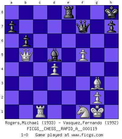 Last move : 1-0 2012 March 13 3:49:26 [Event "FICGS__CHESS__RAPID_A__000119"] [Site "FICGS"] [Date "2011.12.19"] [Round "1"] [White "Rogers,Michael"] [Black "Vasquez,Fernando"] [Result "1-0"] [WhiteElo "1933"] [BlackElo "1992"] 1.e4 e5 2.Nf3 Nf6 3.Nxe5 d6 4.Nf3 Nxe4 5.d4 d5 6.Bd3 Nc6 7.O-O Be7 8.c4 Nb4 9.Be2 O-O 10.Nc3 Bf5 11.a3 Nxc3 12.bxc3 Nc6 13.Re1 Re8 14.cxd5 Qxd5 15.Bf4 Bd6 16.c4 Qe4 17.Be3 Rad8 18.c5 Be7 19.Qb3 b6 20.cxb6 cxb6 21.Bb5 Be6 22.Qa4 Bd5 23.Rac1 Rc8 24.Rc3 Qg6 25.Bd3 Qg4 26.h3 Qd7 27.Ba6 f6 28.Bf4 Bf8 29.Rec1 Re6 30.Nd2 Rce8 31.Bb5 g5 32.Bg3 Rc8 33.Nf1 g4 34.hxg4 Bh6 35.f4 Kh8 36.g5 Bf8 37.f5 Re4 38.Bxc6 Rxc6 39.Rxc6 Re8 40.Qb5 Bxa3 41.gxf6 Bxc1 42.f7 Qxf7 43.Rxc1 1-0 Petrov : Classical attack Kingside Castling by player White (move 7) Kingside Castling by player Black (move 9) Player White won this chess game. Follow this game move after move (download)The passed Pawn is a criminal, who should be kept under lock and key. Mild measures, such as police surveillance, are not sufficient. (Aaron Nimzovich) Die Idee von Capablanca, Schach als Fach in den Schulen zu lehren, ist großartig. (Fidel Castro) Bendita sea la memoria de aquel que dio al mundo este juego inmortal. (A. G. Gardiner) A ce moment-là, je menaçais de comprendre la position ! (Clément L'Heureux) A government big enough to give you everything you want is strong enough to take everything you have. (Thomas Jefferson)