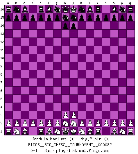 Last move : 0-1 2012 January 18 18:26:41 [Event "FICGS__BIG_CHESS__TOURNAMENT__000082"] [Site "FICGS"] [Date "2011.12.19"] [Round "1"] [White "Jandula,Mariusz"] [Black "Nig,Piotr"] [Result "0-1"] [WhiteElo ""] [BlackElo ""] 0-1 This big chess game has been lost on time (started : 2011.12.19 14:36:8) Follow this game move after move (download)In blitz, the Knight is stronger than the Bishop. (Vlastimil Hort) Ich glaube nicht an Psychologie, ich glaube an gute Züge. (Robert James Fischer) Bobby es la celebridad menos entendida y malinterpretada que camina el la faz de esta tierra. (Yasser Seirawan) Des idées, des idées, j'en ai cent, j'en ai mille. Des bonnes, des mauvaises, applicables, irréalisables... Il suffit de faire le tri ! (Roos) All war is based on deception. (Sun Tzu)