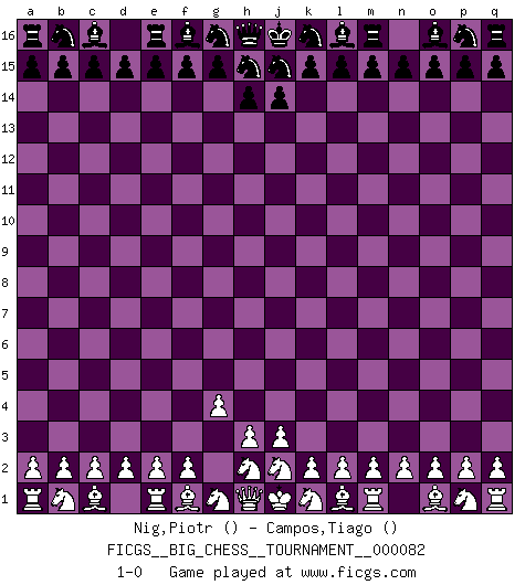 Last move : 1-0 2012 January 21 18:25:53 [Event "FICGS__BIG_CHESS__TOURNAMENT__000082"] [Site "FICGS"] [Date "2011.12.19"] [Round "1"] [White "Nig,Piotr"] [Black "Campos,Tiago"] [Result "1-0"] [WhiteElo ""] [BlackElo ""] 1.g2-g4 1-0 This big chess game has been lost on time (started : 2011.12.19 14:36:8) Follow this game move after move (download)In order to improve your game, you must study the endgame before everything else, for whereas the endings can be studied and mastered by themselves, the middle game and the opening must be studied in relation to the endgame. (Jose Raul Capablanca) Sicherlich können nur Meister einen Stil haben. Daß ein nicht-Meister auch nur ein einziges Mal in seinem Leben eine Partie folgerecht durchführte, habe ich niemals bemerkt. (Emanuel Lasker) Bobby Fischer es el mas grande genio de Ajedrez de todos los tiempos. (Alexander Kotov) Je ne crois pas en la psychologie, je crois aux bons coups. (Robert Fischer) It is not titles that honor men, but men that honor titles. (Niccolo Machiavelli)