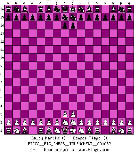Last move : 0-1 2012 January 18 18:26:41 [Event "FICGS__BIG_CHESS__TOURNAMENT__000082"] [Site "FICGS"] [Date "2011.12.19"] [Round "1"] [White "Selby,Martin"] [Black "Campos,Tiago"] [Result "0-1"] [WhiteElo ""] [BlackElo ""] 0-1 This big chess game has been lost on time (started : 2011.12.19 14:36:8) Follow this game move after move (download)Bobby is the finest Chess player this country ever produced. His memory for the moves, his brilliance in dreaming up combinations, and his fierce determination to win are uncanny. (John Collins) Nur ein wirklich starker Spieler weiß wie schwach er spielt. (Savielly Grigorievitsch Tartakower) Los Peones son el alma de una partida de Ajedrez. (Francois Andre Danican Philidor) Plusieurs personnes se sont demandées comment Tal faisait pour gagner... En fait, c'est très simple ! Il met ses pièces au centre de l'échiquier et les sacrifie quelque part ! (David Bronstein) The problem with troubleshooting is that trouble shoots back. (Anonymous)