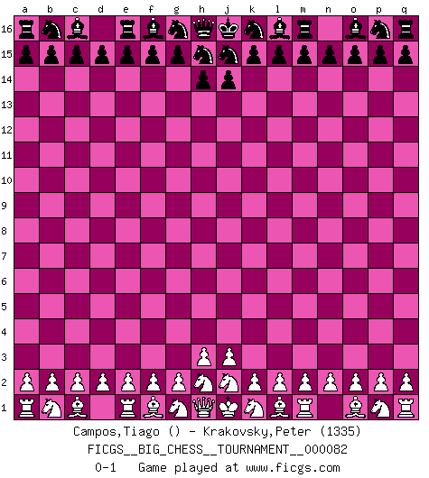 Last move : 0-1 2012 January 18 18:26:41 [Event "FICGS__BIG_CHESS__TOURNAMENT__000082"] [Site "FICGS"] [Date "2011.12.19"] [Round "1"] [White "Campos,Tiago"] [Black "Krakovsky,Peter"] [Result "0-1"] [WhiteElo ""] [BlackElo "1335"] 0-1 This big chess game has been lost on time (started : 2011.12.19 14:36:8) Follow this game move after move (download)Chess is like war on a board. (Bobby Fischer) Das Schachspiel ist ein See, in welchem eine Mücke baden und ein Elefant ertrinken kann. (Emanuel Lasker) No hay otro maestro que tenga una voluntad terrífica de ganar. Al tablero, el irradía peligro y aún los oponentes mas fuertes tienden a congelarse como liebres cuando olfatean a una pantera. Aún sus debilidades son peligrosas. Con las blancas, su juego de apertura es predecible - te es posible hacer planes en su contra - pero es tan fuerte que tus planes casi nunca funcionan. En el juego medio, su precisión e invención son fabulosas y en finales, tú simplemente no le puedes vencer. (Experto Alemán anónimo) Il n'y a pas eu de défaite parce que je ne crois pas que cet ordinateur ait jamais existé. IBM a triché en refusant d'imprimer les modes de recherche de la machine. C'est évident, pendant le match, des coups décisifs ont été joués par des êtres humains. Aujourd'hui, les meilleurs spécialistes en informatique ne peuvent toujours pas expliquer comment Deep-Blue a pu jouer contre la logique des ordinateurs. IBM a gagné une guerre de communication, mais ils sont incapables de prouver que l'ordinateur a gagné tout seul. (Garry Kasparov) You cannot beat a roulette table unless you steal money from it. (Albert Einstein)