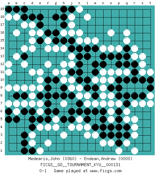 Last move : 0-1 2012 April 5 4:5:54 [Event "FICGS__GO__TOURNAMENT_KYU__000131"] [Site "FICGS"] [Date "2011.12.19"] [Round "1"] [Black "Medearis,John"] [White "Endean,Andrew"] [Result "0-1"] [Rating 1 "0360"] [Rating 2 "0000"] 1.d4 q16 2.q4 d16 3.q10 k4 4.k6 h3 5.d10 c12 6.k10 k16 7.k13 m13 8.p13 o14 9.o13 p14 10.q14 o16 11.m14 n14 12.n13 m15 13.l14 q15 14.m12 l15 15.l13 r5 16.q7 r4 17.q3 r3 18.n3 m3 19.m4 l3 20.n4 n2 21.h5 g4 22.f5 f4 23.e5 e4 24.c6 d3 25.d5 r14 26.q13 r13 27.r12 s12 28.r11 s11 29.s10 s13 30.f16 f15 31.e15 e16 32.g15 f14 33.g16 d14 34.e17 d17 35.e18 g14 36.g18 e11 37.g10 e10 38.c3 d2 39.c2 g5 40.g6 e9 41.f9 f12 42.e8 d9 43.c10 c9 44.b10 b9 45.a10 a9 46.b12 b13 47.c11 a12 48.b11 d11 49.c8 d8 50.g8 e7 51.f8 c7 52.d6 d7 53.f7 e6 54.f6 h11 55.j11 j12 56.k12 j10 57.k11 j13 58.j14 h14 59.j15 j16 60.h15 h16 61.h17 j17 62.b8 b7 63.c13 a11 64.h18 j18 65.d18 c17 66.c18 b18 67.b19 a18 68.c19 b6 69.b5 q5 70.p4 q2 71.p2 o2 72.o3 p1 73.p3 r1 74.l5 k5 75.m6 k15 76.k14 h10 77.h9 g11 78.f10 j9 79.j8 k9 80.l9 k8 81.k7 l8 82.m8 l7 83.l6 m7 84.m9 n7 85.o7 n8 86.o9 n9 87.n10 o8 88.p8 o10 89.p9 m10 90.l10 n11 91.m11 n10 92.n12 o6 93.p6 p7 94.p5 o7 95.p10 p11 96.q12 q11 97.r10 q6 98.r8 r7 99.q8 s7 100.s8 t8 101.t9 t7 102.t10 t11 103.p12 o11 104.n6 o5 105.n5 h12 106.j5 j4 107.a6 a7 108.a5 l4 109.j6 h7 110.h8 c14 111.j19 k19 112.h19 l18 113.d1 e1 114.c1 f2 115.a19 b16 116.o4 d15 117.pass pass 0-1 Here are the names of the openings (joseki) played in the four corners : Corner d4 : d4 h3 Hoshi (Hwajeom, Seongjeom, Xingwei`) 4-4 Point. The star or hoshi (4-4) point, emphasizing influence at the potential expense of territory. Corner q4 : q4 r5 Hoshi (Hwajeom, Seongjeom, Xingwei`) 4-4 Point. The star or hoshi (4-4) point, emphasizing influence at the potential expense of territory. Player White won this Go (weiqi, baduk) game. Follow this game move after move (download)When you study joseki, you lose two stones in strength. (Anonymous) I've lost money so fast in these clubs it's left me reeling. I've read every poker book ever written, but the only way to get better at the game is to go out and play with people who are really good. The problem is, you stand to lose a lot of money doing it. (Matt Damon)